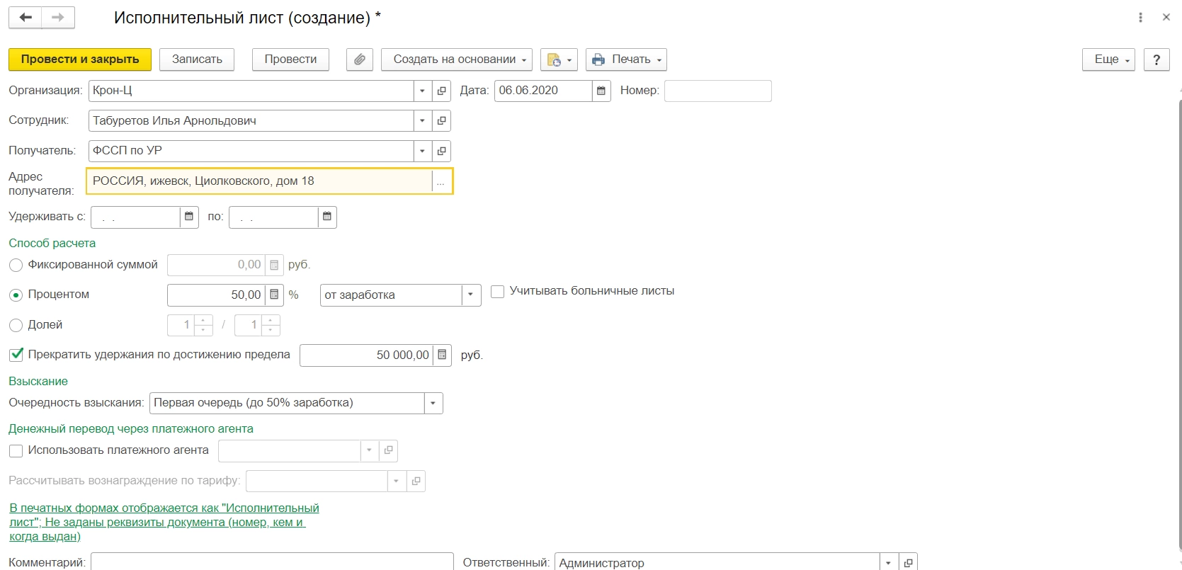 Иногда приходится регистрировать не самые приятные документы для сотрудника, например, исполнительный лист. В программе 1С:ЗУП КОРП реализована соответствующая форма документа, которая позволяет работать с исполнительными листами.