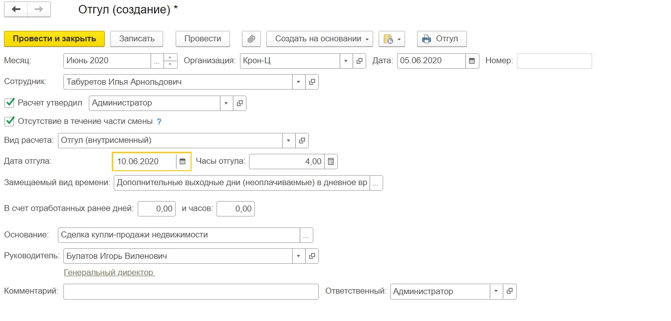 Документ «Отгул» оформляется внутри смены или на определенное количество рабочих дней с возможностью освобождения ставки.