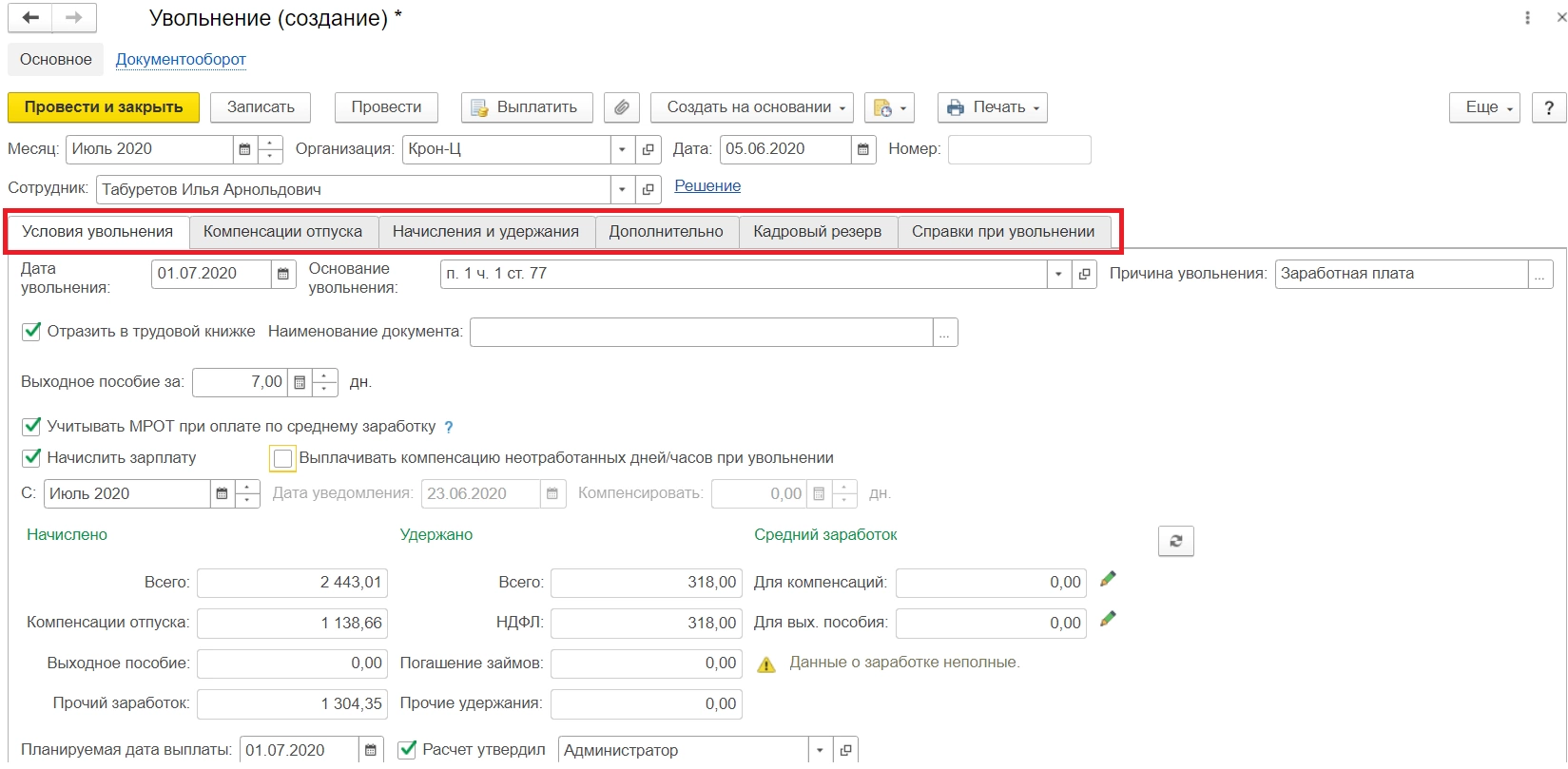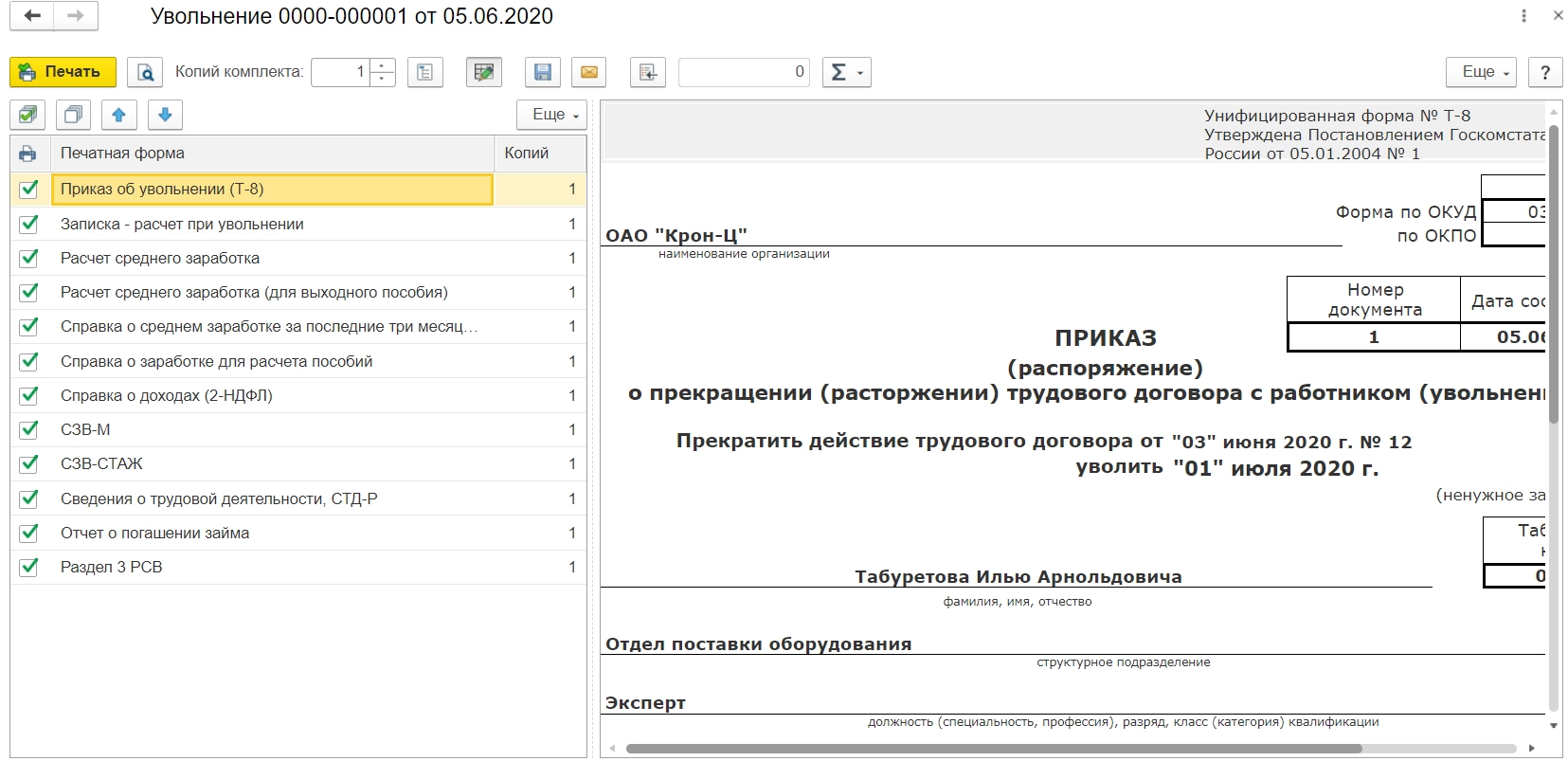 Замыкает «жизненный цикл» работы сотрудника в компании документ «Увольнение».