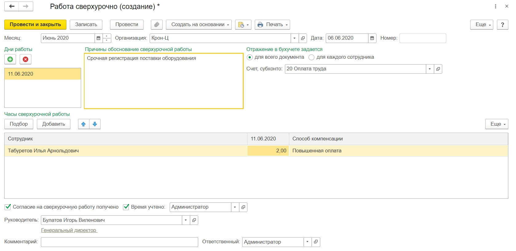Когда необходимо зарегистрировать факт сверхурочной работы сотрудника, создается документ «Работа сверхурочно».