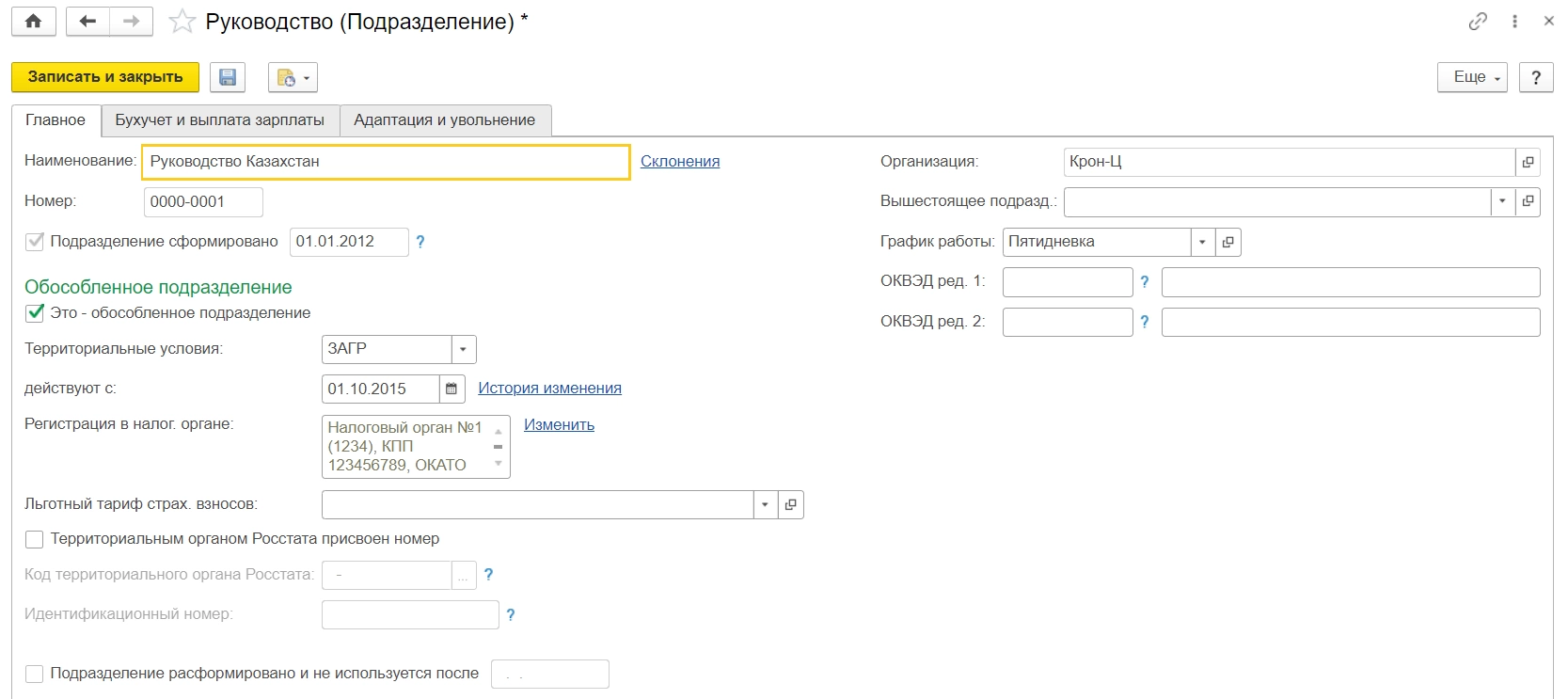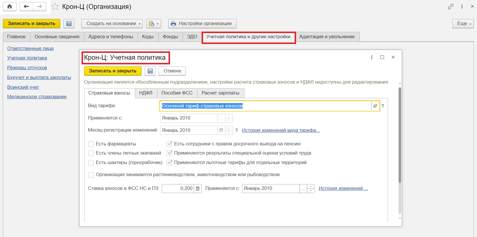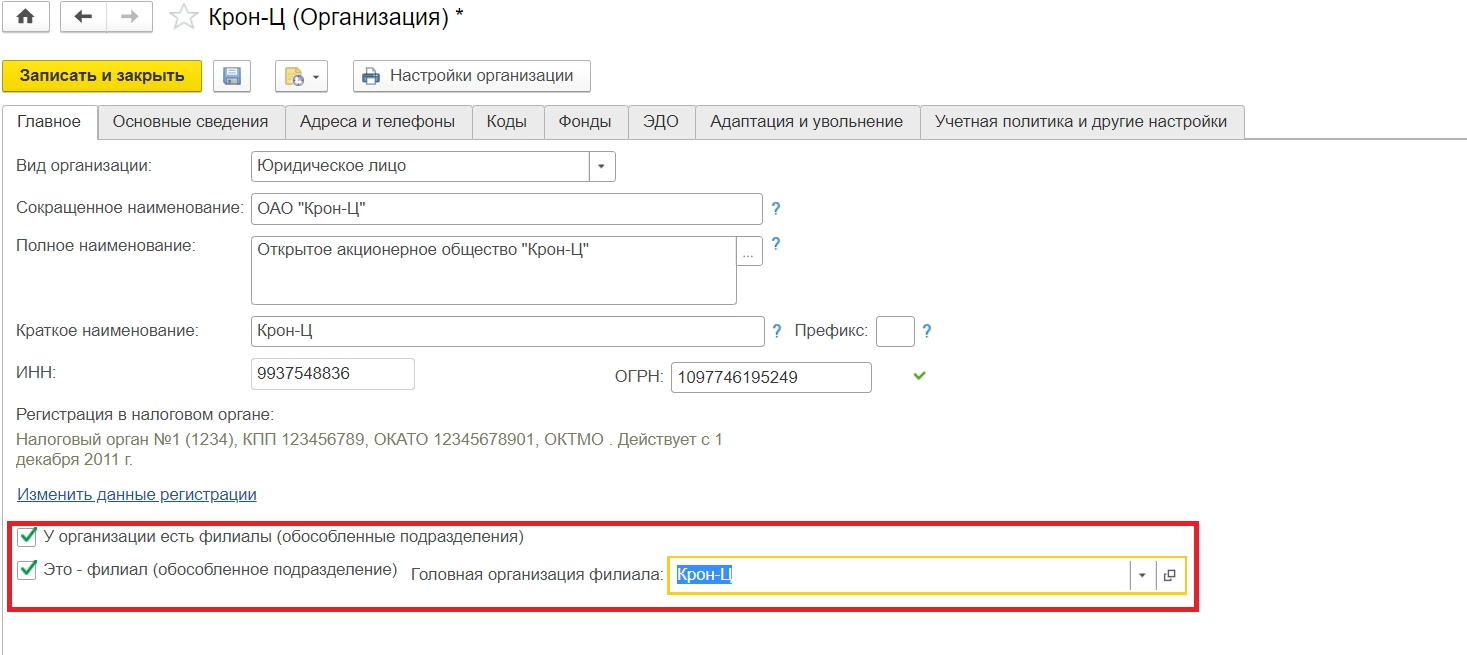 Настройки на уровне организации позволяют выделить обособленное подразделение или филиал.