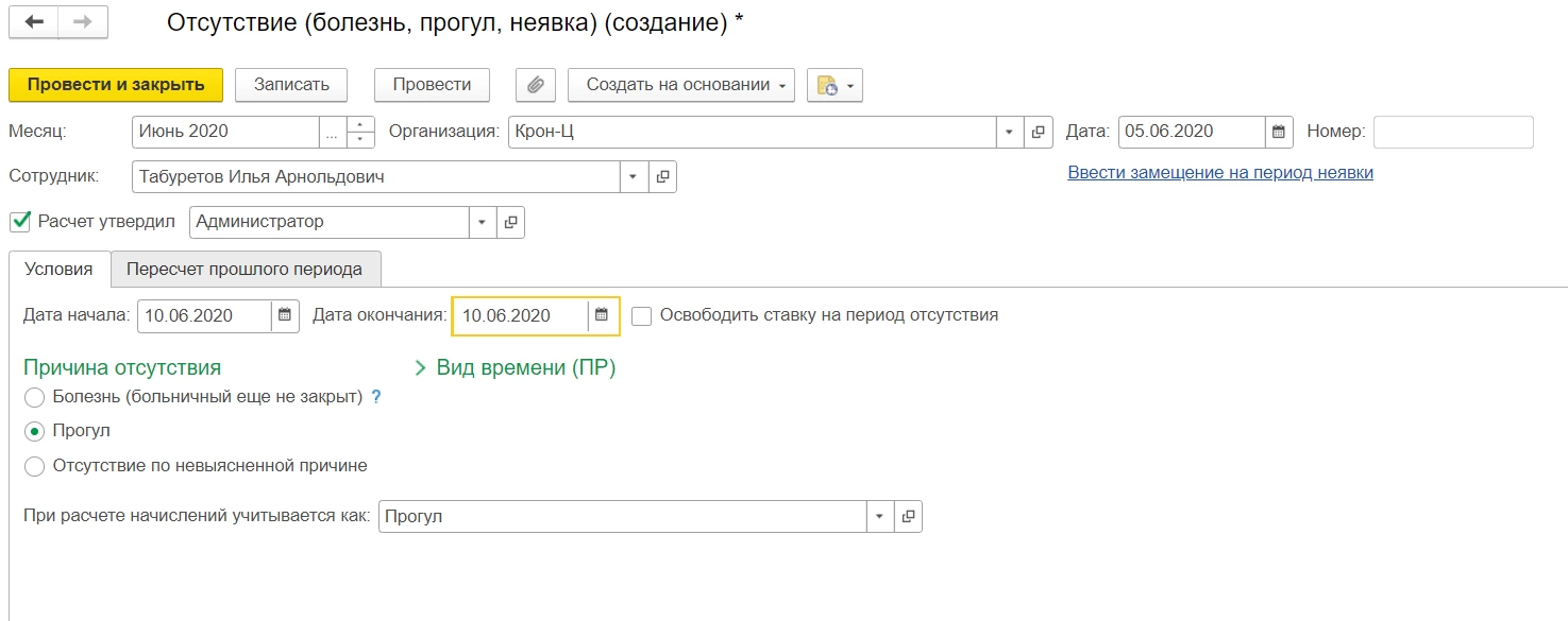 Документ «Отсутствие (Болезнь, прогул, неявка)» нужен, когда работник отсутствовал по невыясненной причине, неявке по причине болезни, но без закрытого больничного листа или в случае доказанного прогула рабочей смены.
