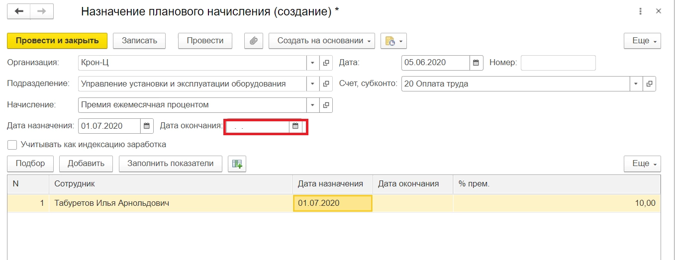 Здесь же можно выставить дату, до которой будет действовать данное начисление для сотрудника.