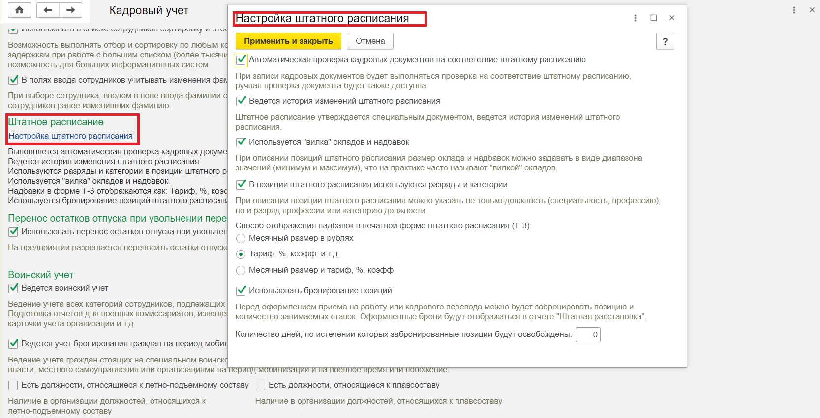 При включении автоматической проверки кадровых документов будет выдаваться предупреждение, если вы, например, захотите принять сотрудника на работу при недостатке свободных ставок в позициях штатного расписания.