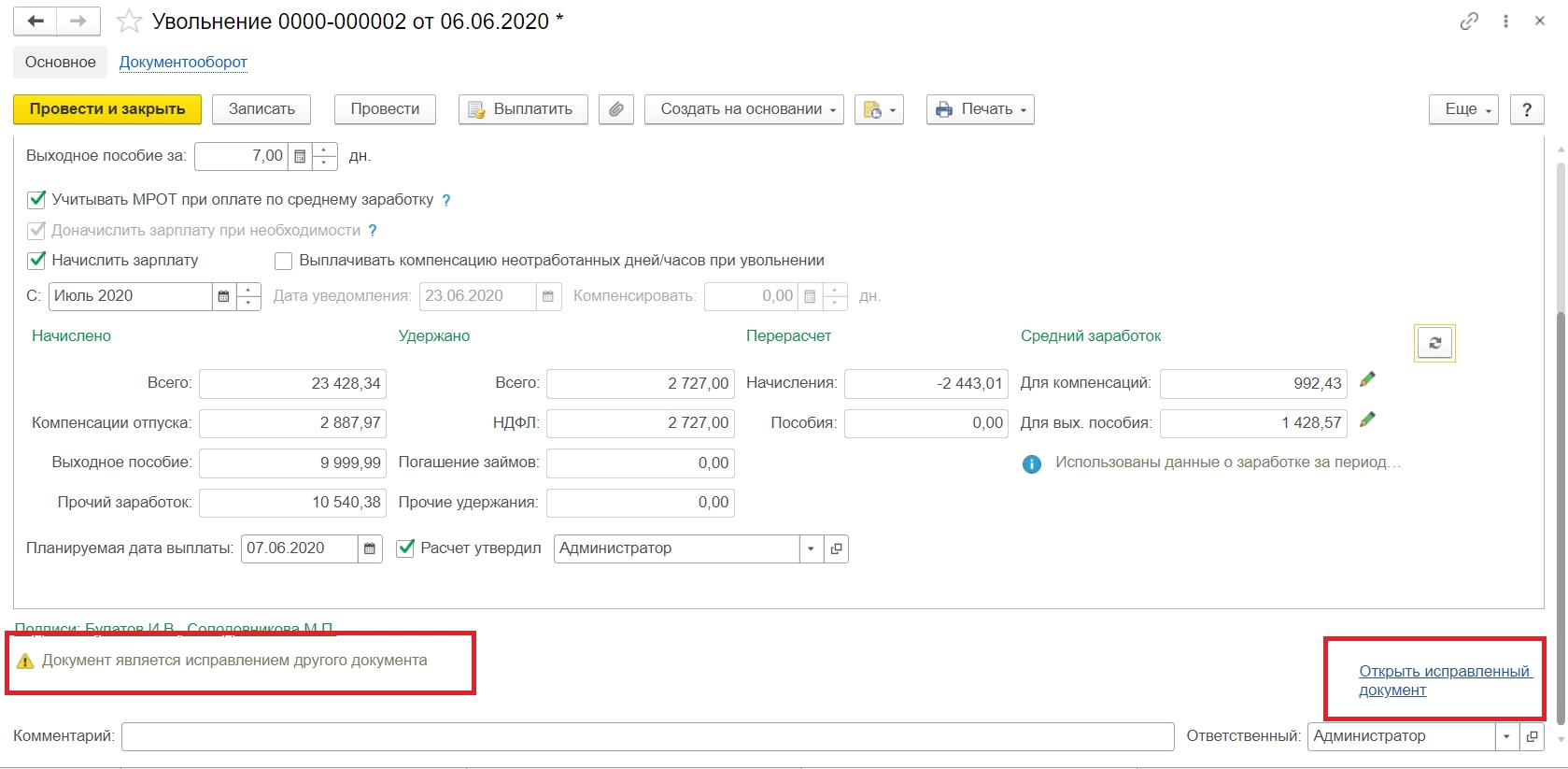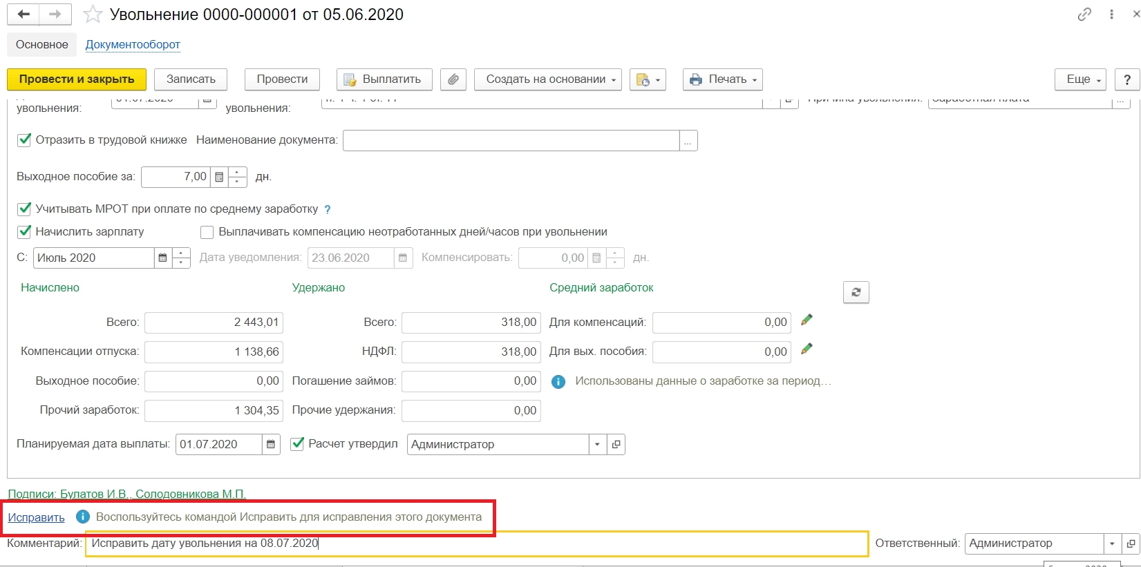 Открывается документ-исправление, где мы меняем интересующие нас данные – дату увольнения, и жмем «Провести». В программе останется два варианта документа – исправленный вариант и документ-исправление. В нижней части документа будет соответствующая подсказка об исправлении и ссылка на исправленную версию.