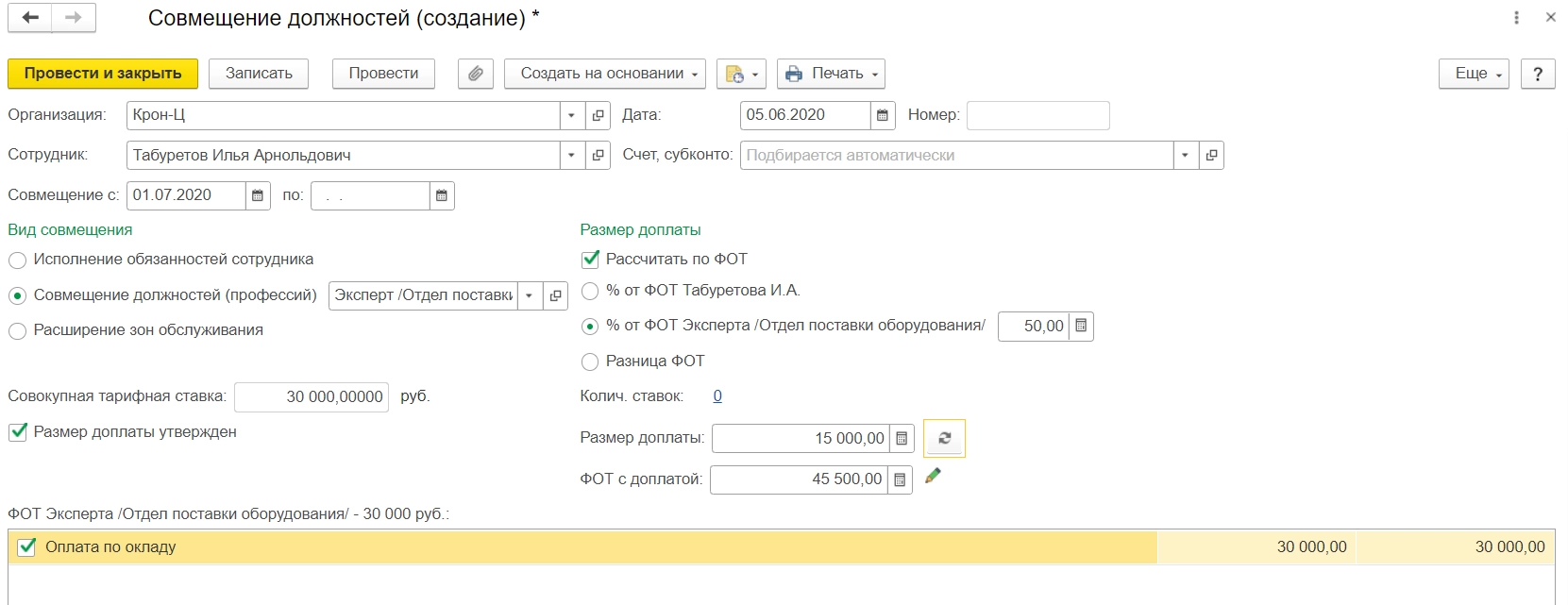 В последнем случае можно выбрать один из трех вариантов причины совмещения, а также более точно произвести расчет доплаты, используя фот должности, сотрудника или разницу между размерами фот.