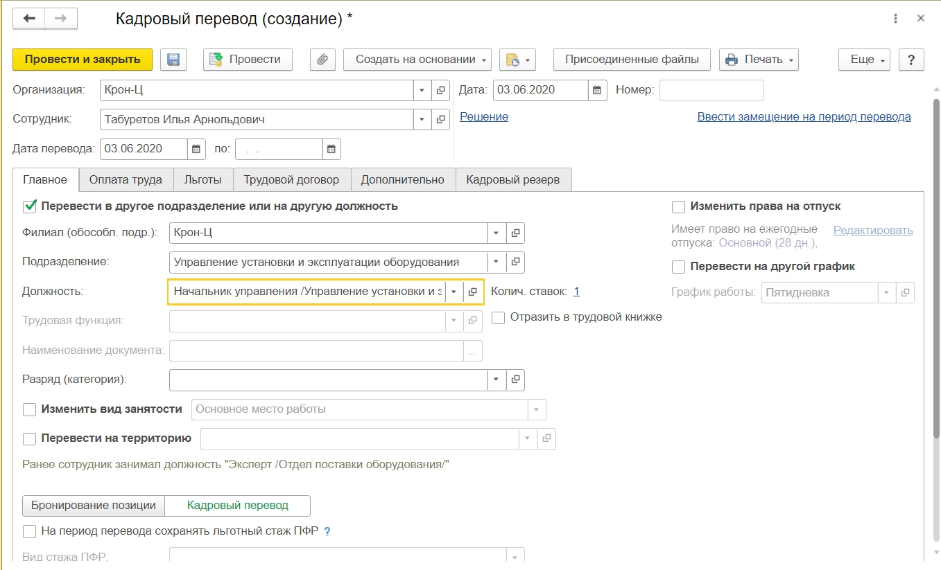 По мере необходимости сотрудника могут перевести на другую должность. Это может быть перевод на постоянной основе, например, если это повышение по службе, или временный – если на занимаемой должности отсутствует загруженность. Для оформления подобных кадровых движений в программе существует документ «Кадровый перевод».