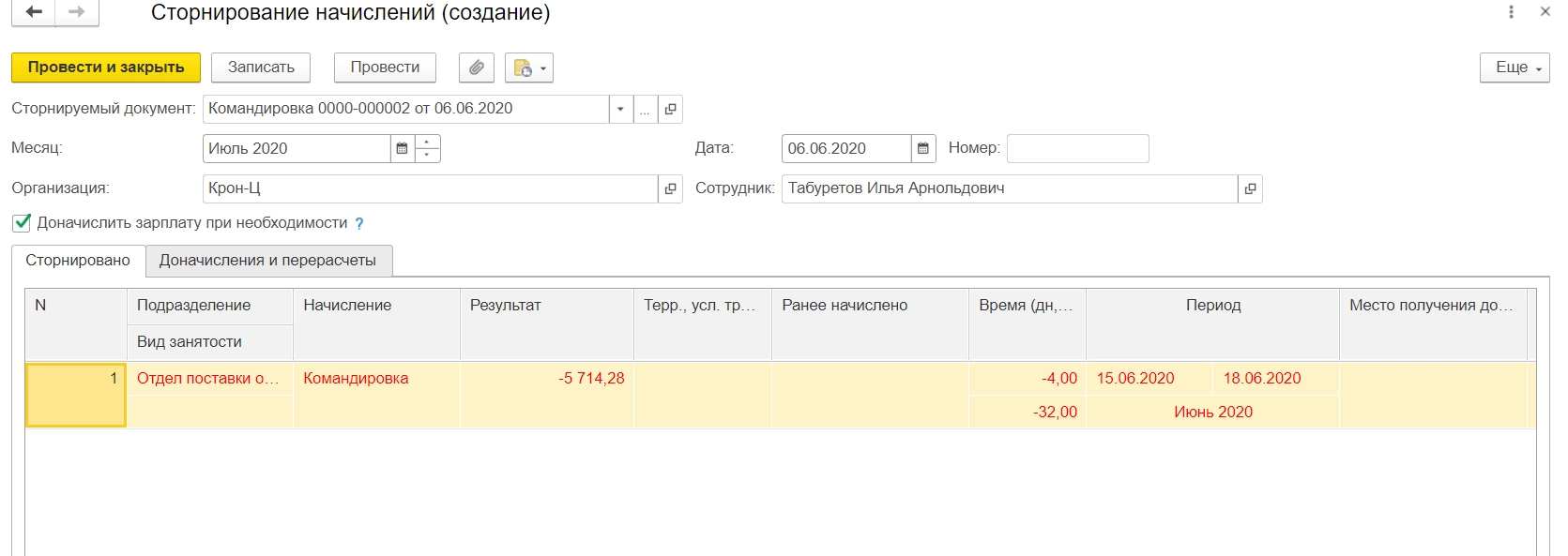 Однако командировка отменилась, и поэтому нам необходимо отметить это в программе, но так чтобы отменились выплаты сотруднику, рассчитанные из среднего заработка на период нахождения в командировке. Для этого в левом нижнем углу нажимаем «Сторнировать».