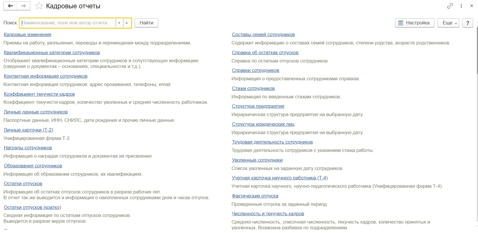 Для упрощения работы кадровиков в программе 1С:ЗУП предусмотрено большое количество встроенных отчетов, которые легко настроить под индивидуальные потребности.