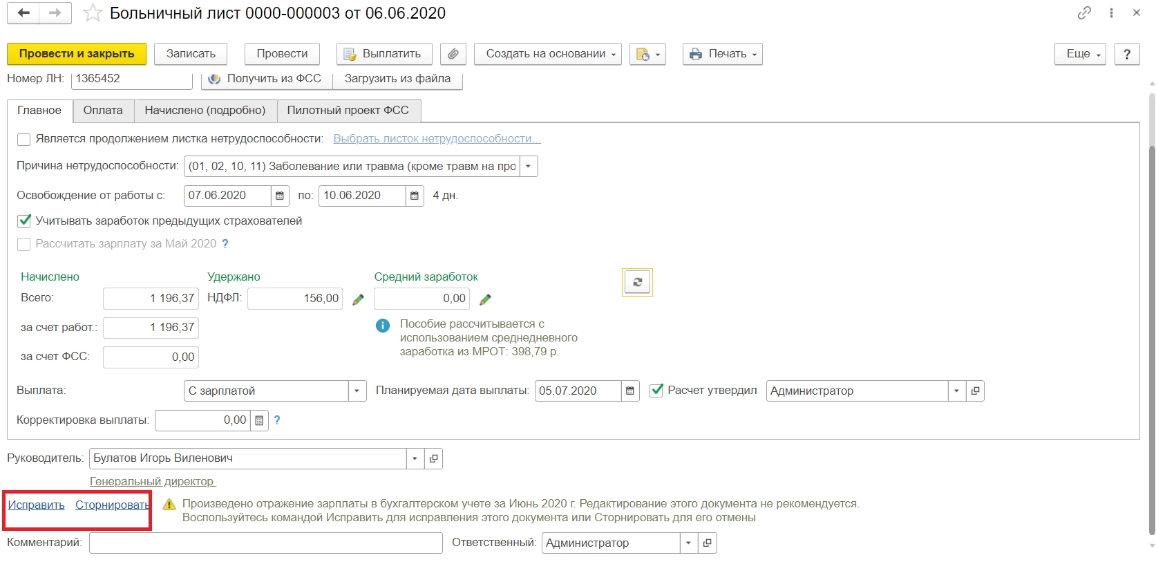 Возможность редактирования и сторнирования с сохранением исправленных или сторнированных вариантов, также присутствует в документе «Больничный лист».