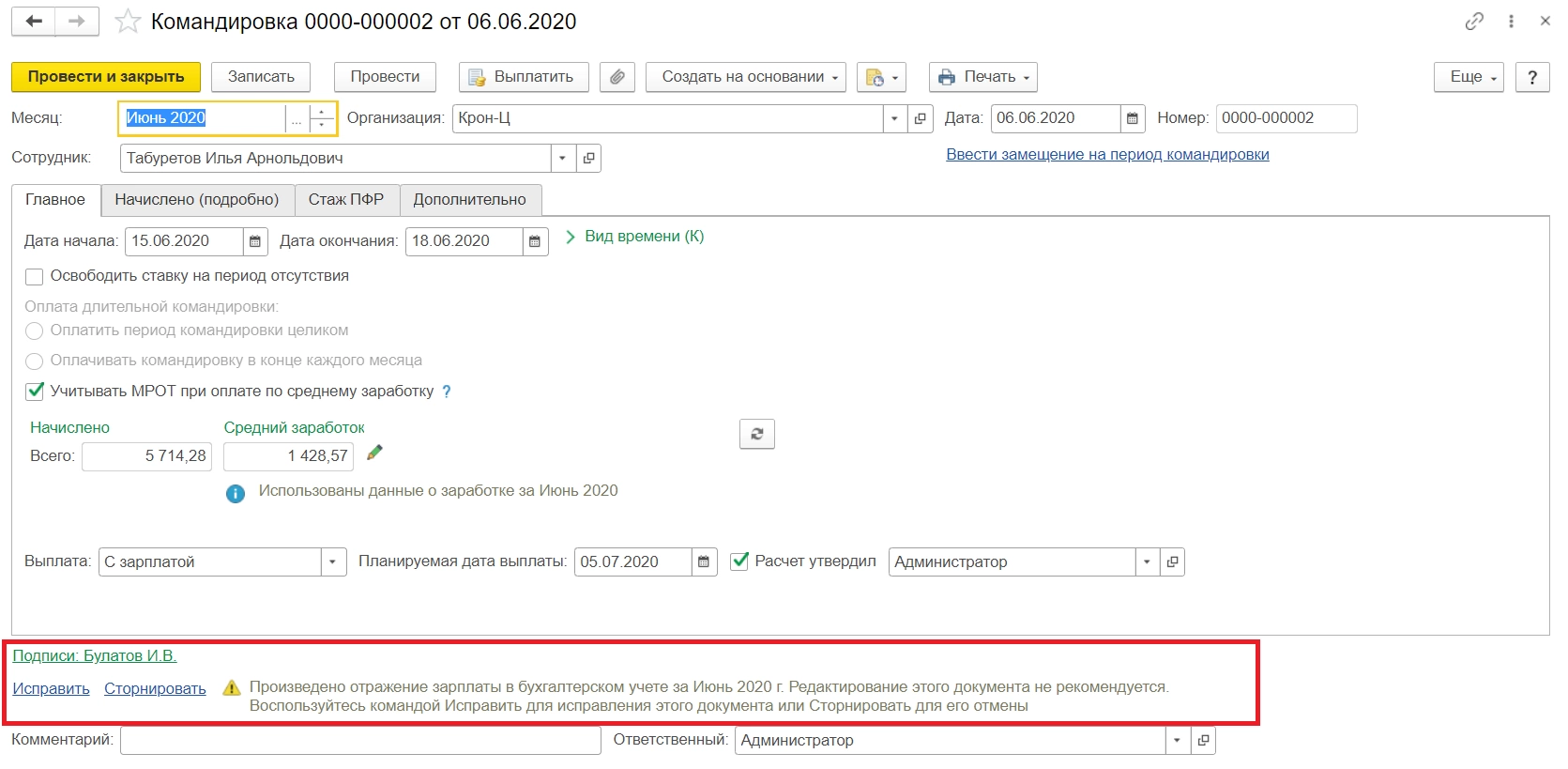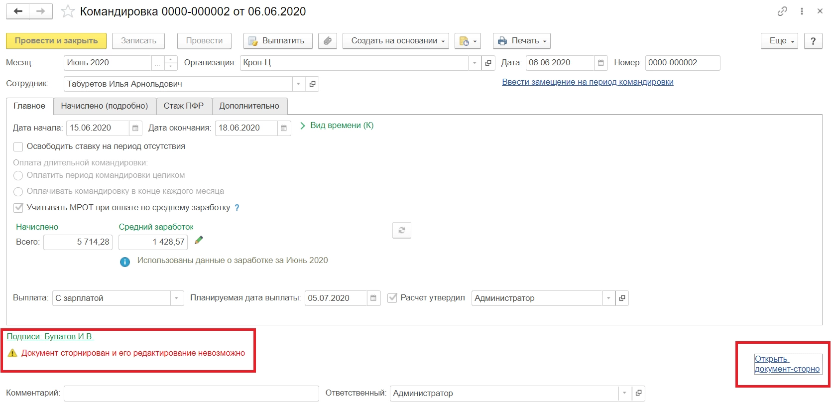 После проведения сторнирования документа «Командировка», его нельзя редактировать, но в правом нижнем углу есть ссылка на первоначальную версию документа, которая была сторнирована.