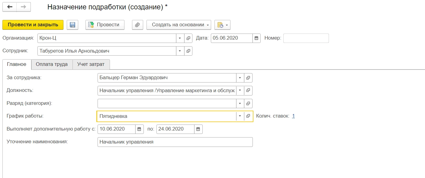 Когда работник выполнял какую-либо работу за другого сотрудника, для отображения этого факта следует воспользоваться документом «Назначение подработки» или «Совмещение должностей».