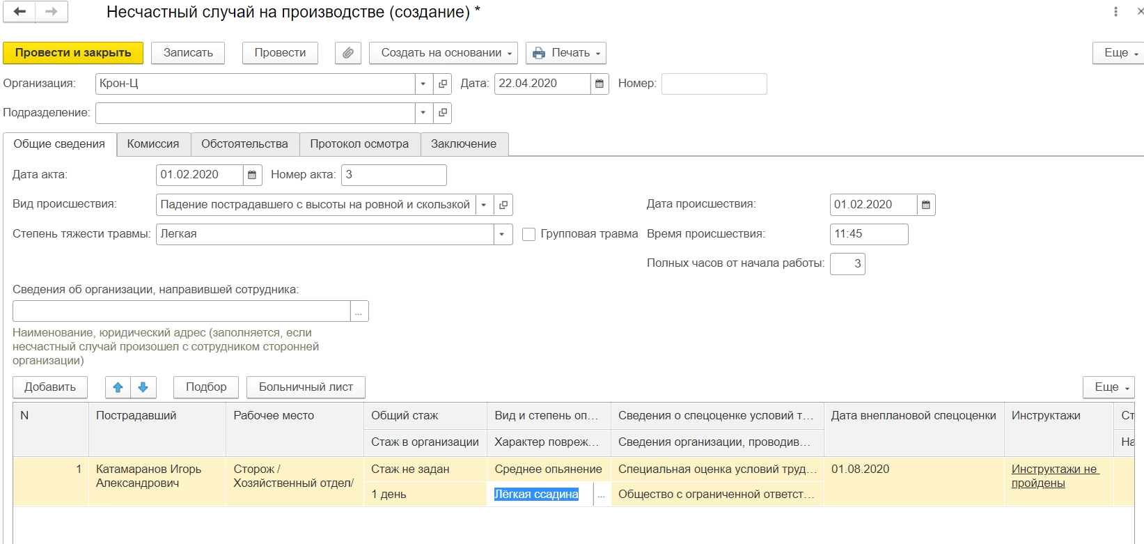 В программе 1С:ЗУП КОРП есть возможность оформить акт о несчастном случае на производстве (Форма Н1), на основании которого можно оперативно подготовить целый пакет документов: