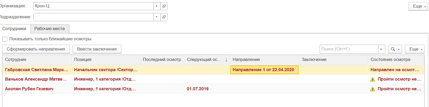 Этим функционалом пользуются и кадровики, и инженеры или специалисты по ОТ, т.к. процессы, связанные с медицинским осмотром сотрудников, затрагивают и отдел кадров, и отдел охраны труда.