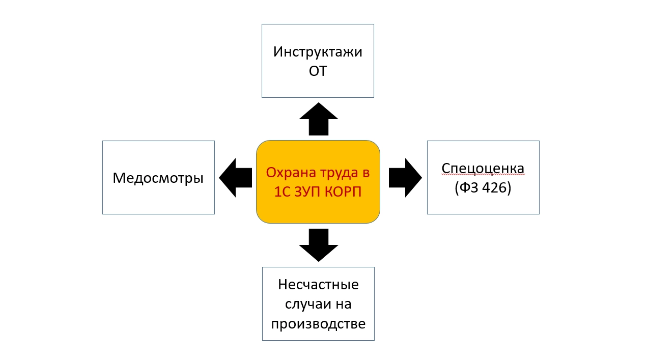Возможности 1С:ЗУП КОРП в части автоматизации охраны труда разбиты на четыре основных части, особенности которых мы рассмотрим далее