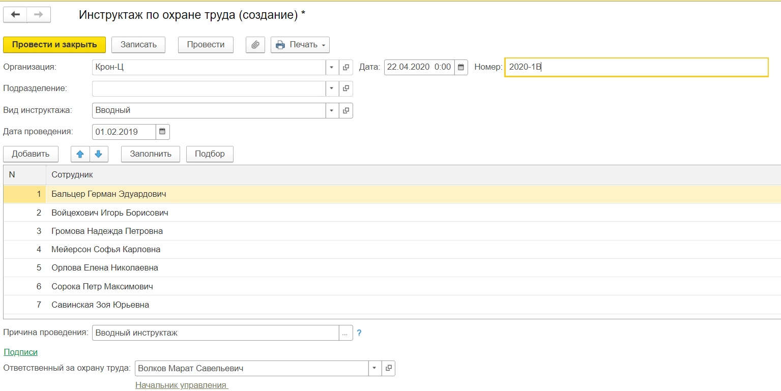 В этом же разделе ЗУП можно найти журнал регистрации прохождения инструктажей, где присутствует дата документа, список сотрудников и ответственный работник за прохождение инструктажей по ОТ. Ввиду действующего законодательства компьютерная программа по охране труда не может заменить бумажный журнал, но способна заметно облегчить жизнь инженерам и специалистам по охране в плане мониторинга прохождения инструктажей и их результатов на местах.