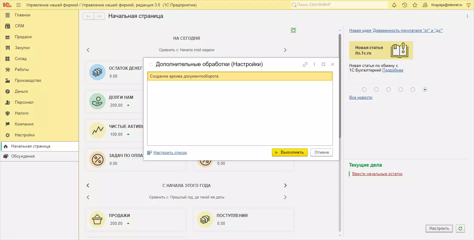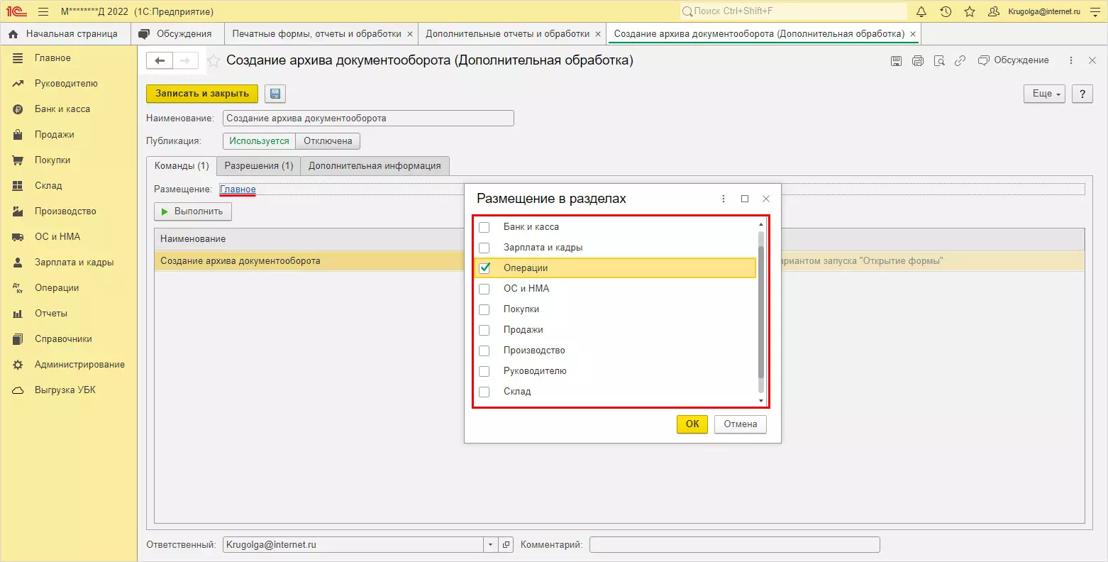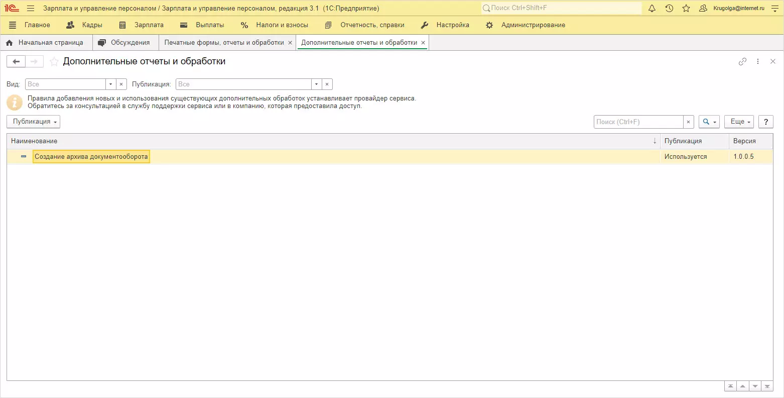 Указанного раздела Настройки в приложении нет. Проверим установку, открыв раздел Администрирование - Печатные формы, отчеты и обработки - Дополнительные отчеты и обработки. В списке появилась установленная внешняя обработка Создание архива документооборота. Открыв ее можно увидеть дополнительное место ее размещения (раздел Главное) и при необходимости его изменить, указав в какой раздел поместить дополнительное меню с обработками.