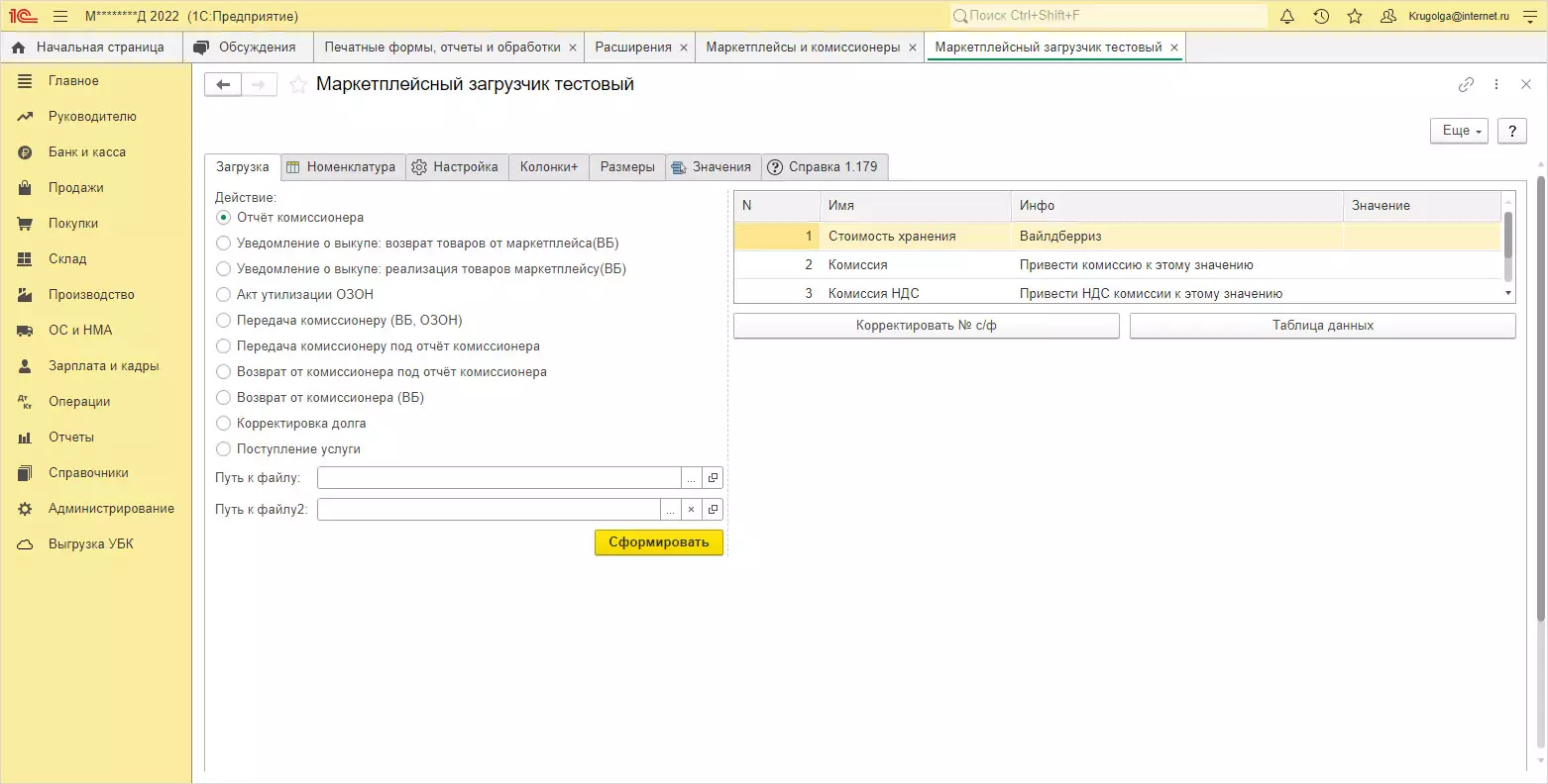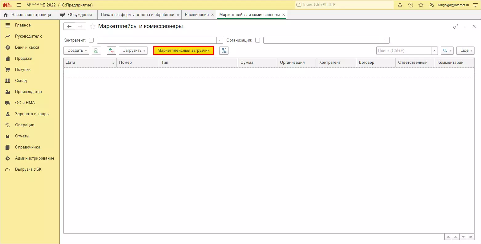 В примере адаптации расширения к конфигурации результатом установки стало появление дополнительной кнопки для загрузки с маркетплейсов – Маркетплейсный загрузчик.