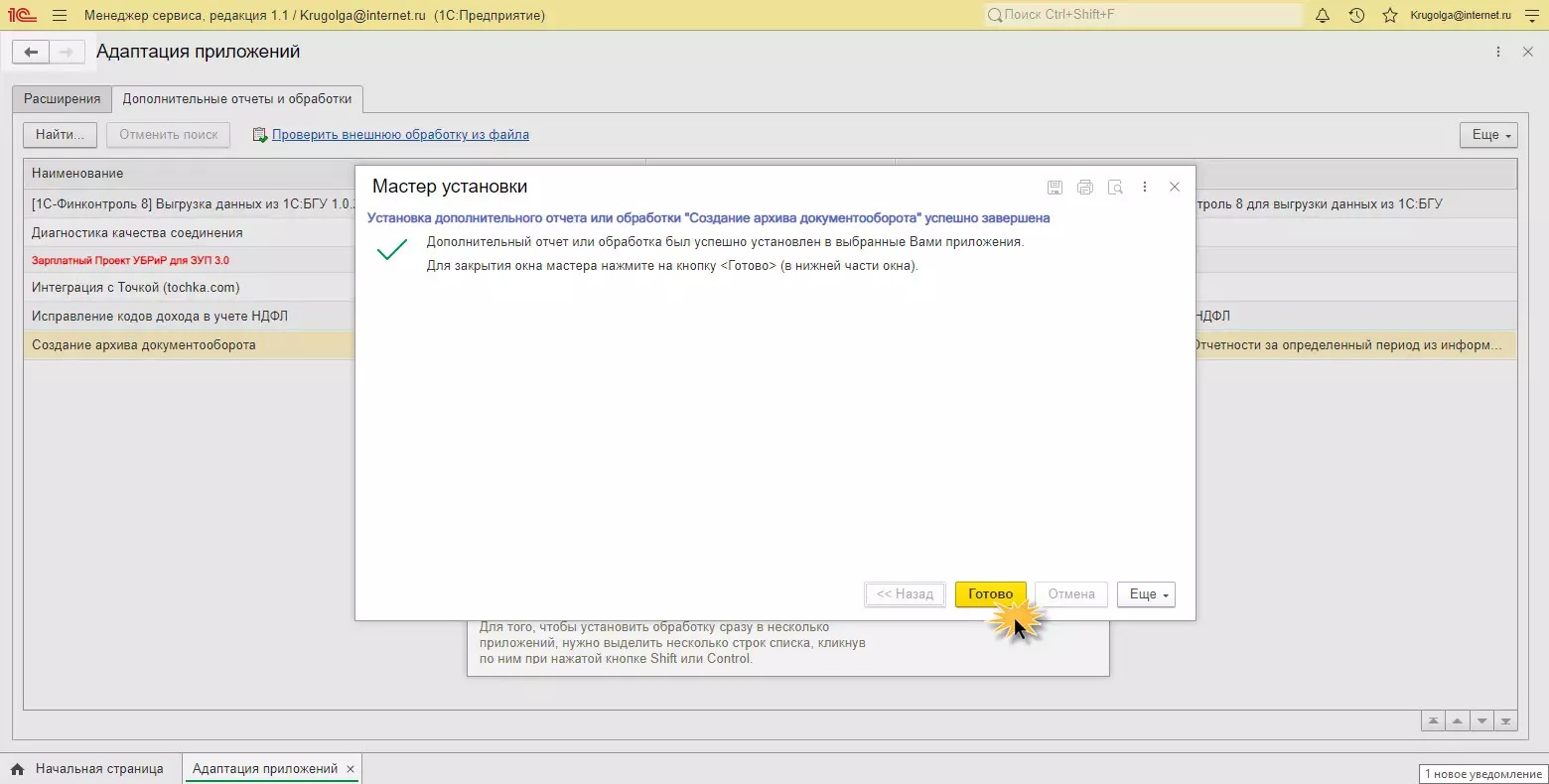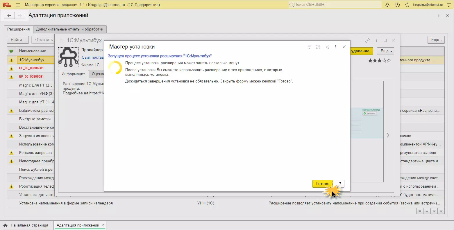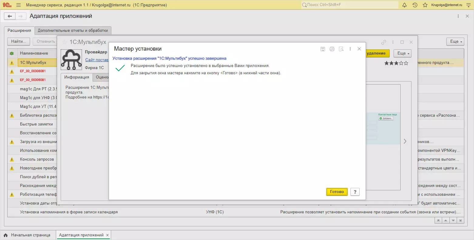 По завершению система сообщит об успешной установке расширения в облачную базу 1С.