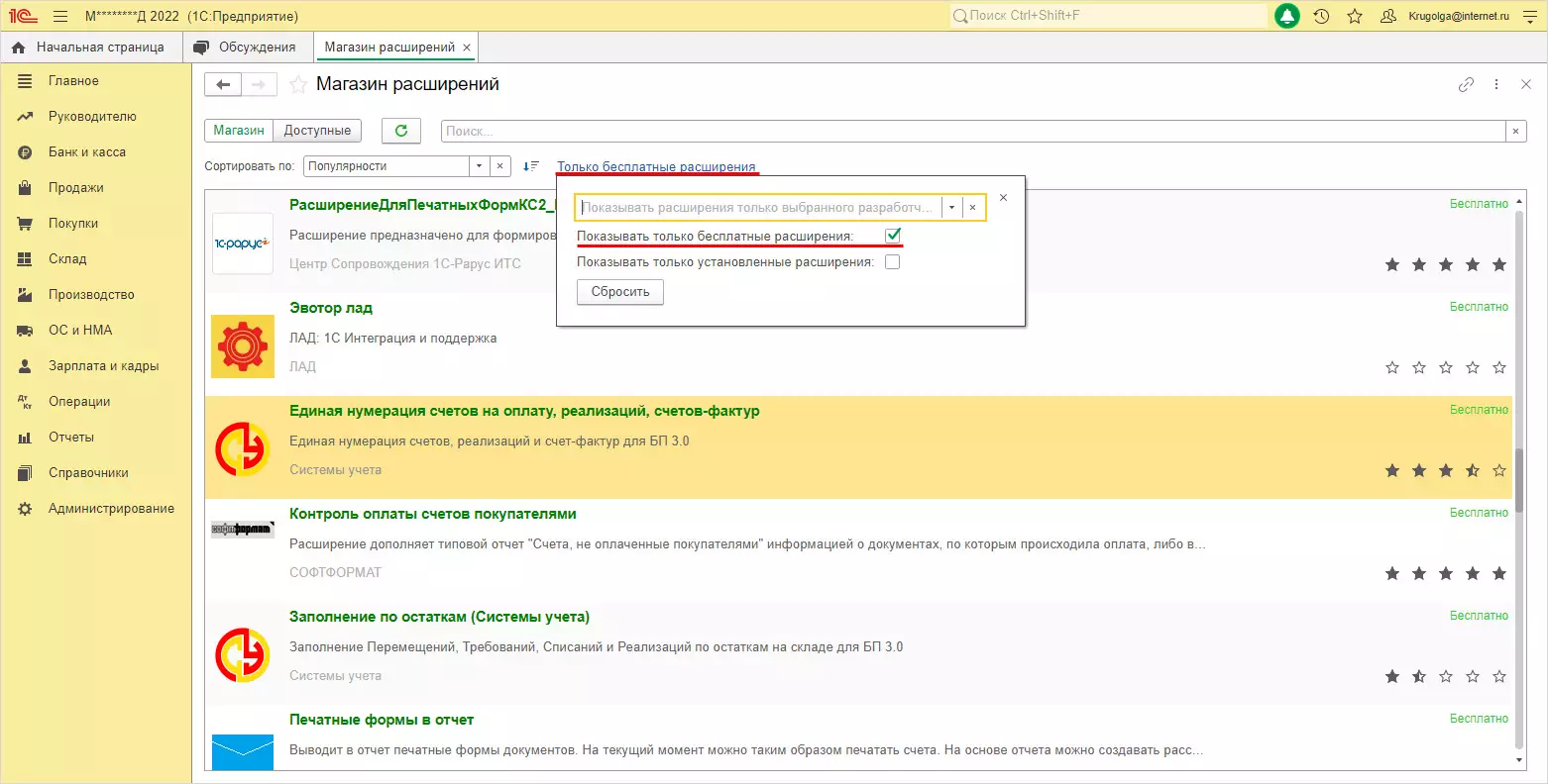Расширения есть платные и публикуемые бесплатно. С помощью установки фильтров можно сделать отбор. Например, показывать только бесплатные расширения или отразить список конкретного разработчика расширения, указав его название в поле, выбрав из списка партнеров 1С.