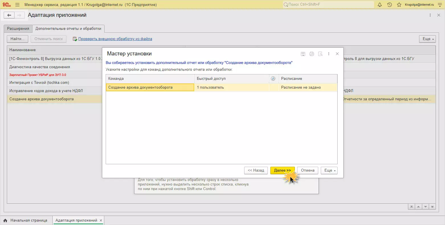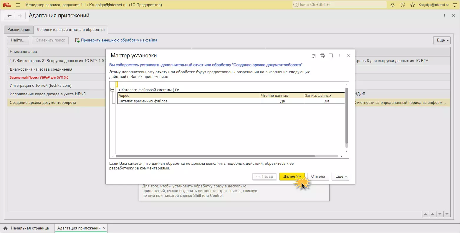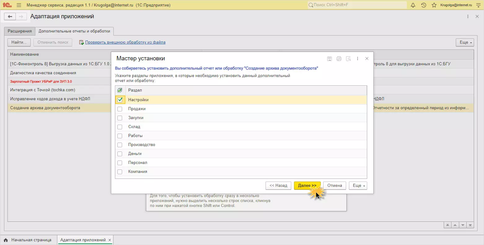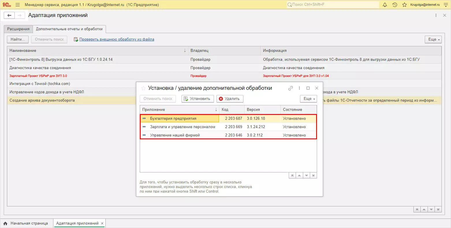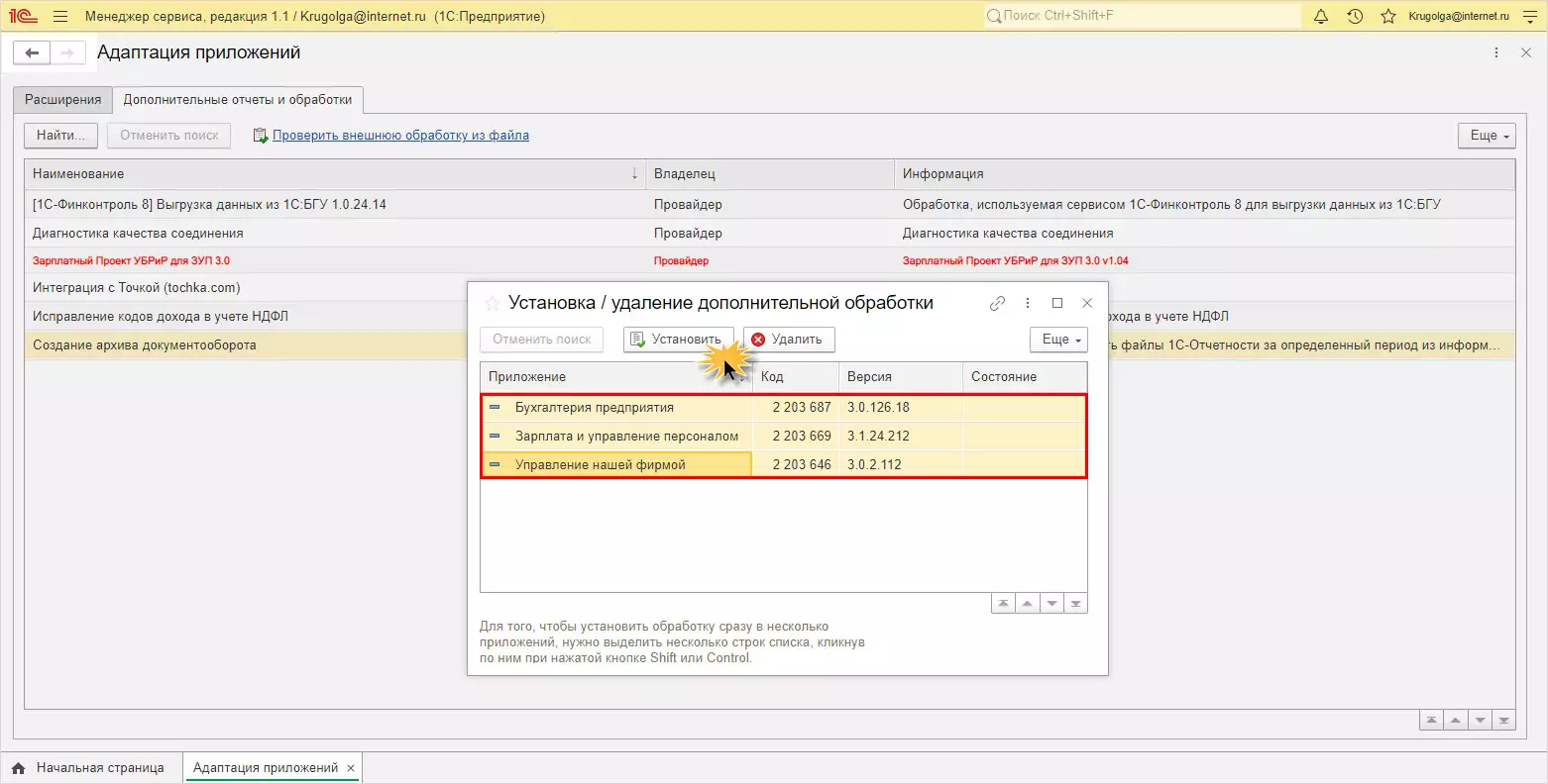 Шаг 1. В разделе Адаптация приложений личного кабинета перейдите на вкладку Дополнительные отчеты и обработки. Откройте обработку, укажите приложения для установки и нажмите Установить.