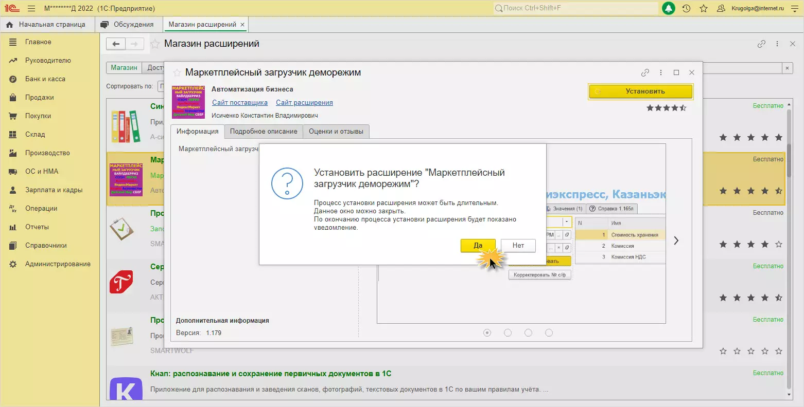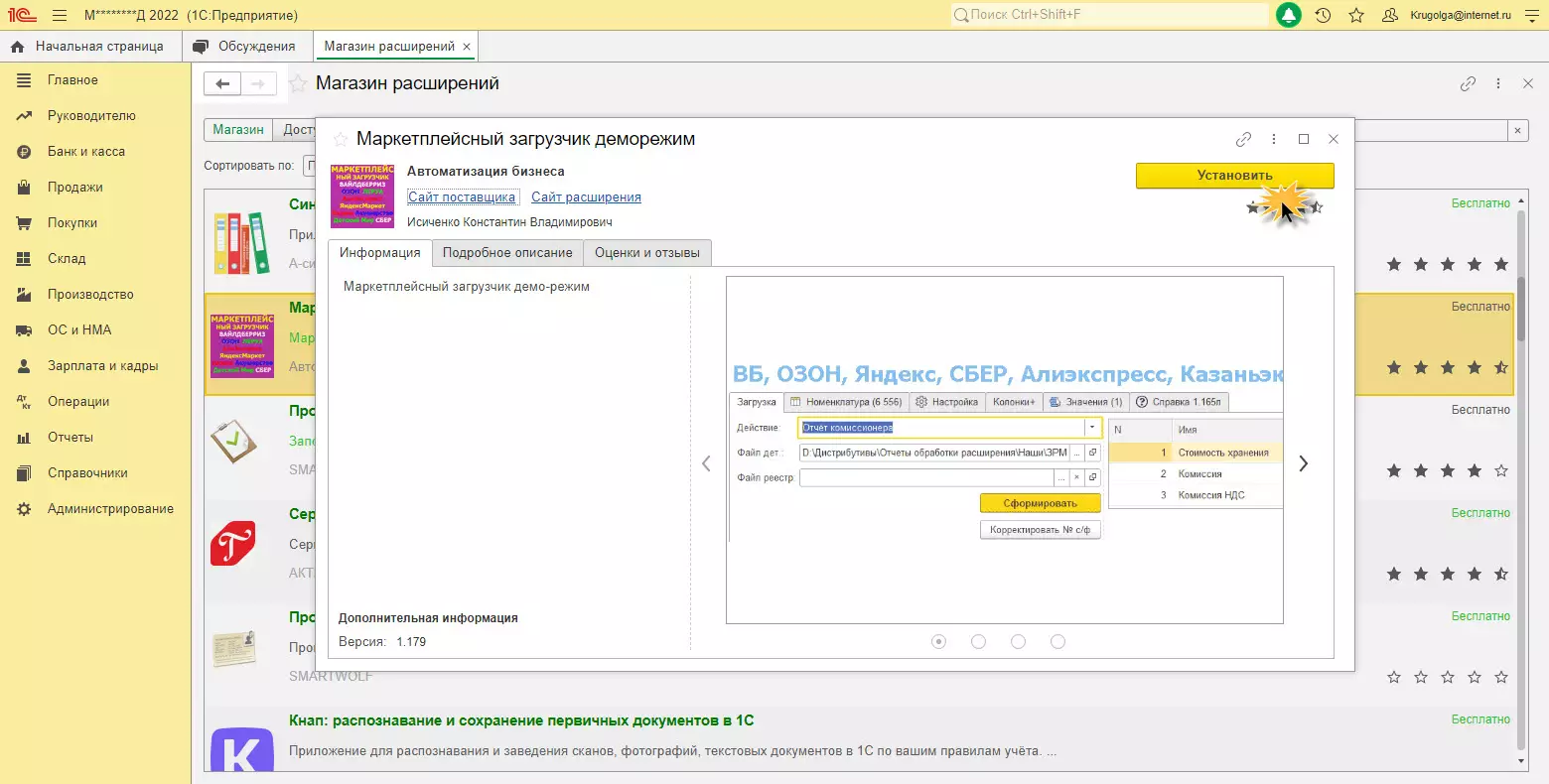 Установка из магазина позволяет пользователю выбрать расширение из каталога. С помощью Магазина расширений можно расширить функционал программы, сделать работу пользователя более удобной и эффективной. Здесь представлены множество разработок программистов, которые дополняют и адаптируют 1С.