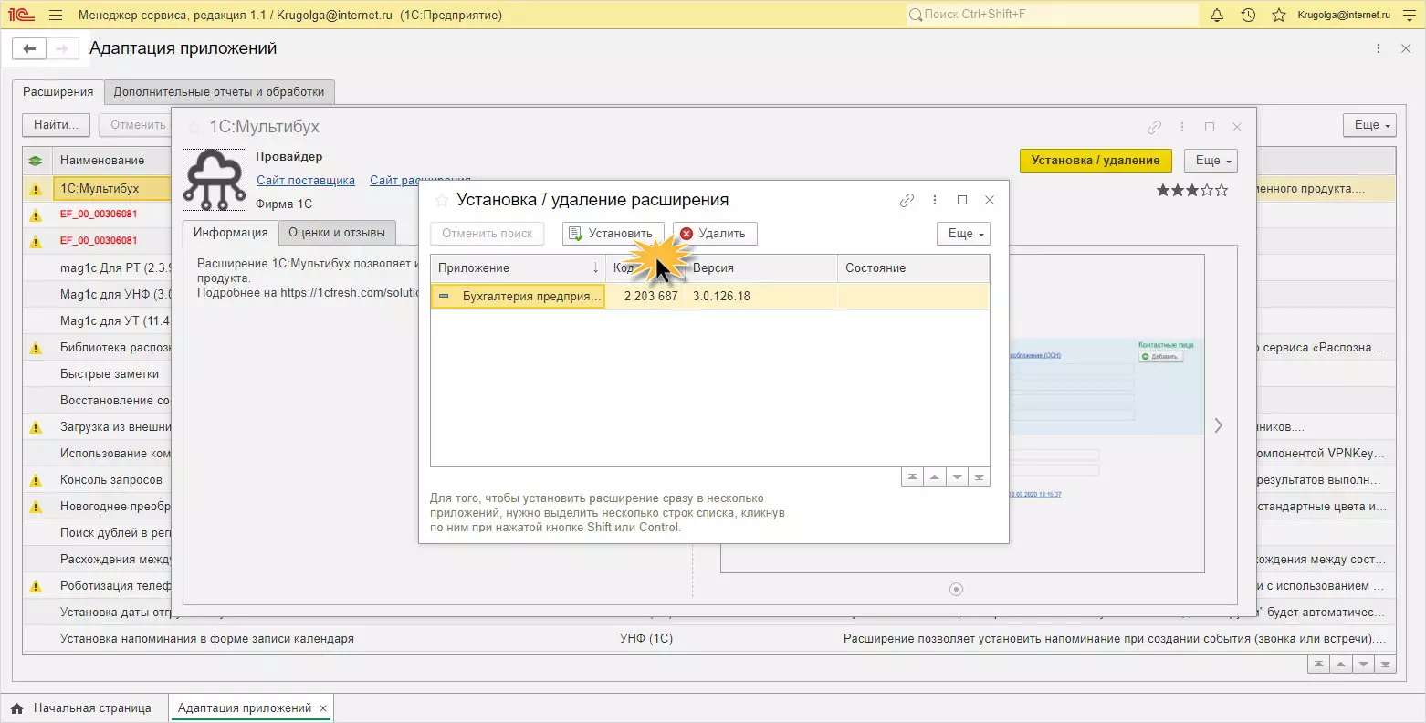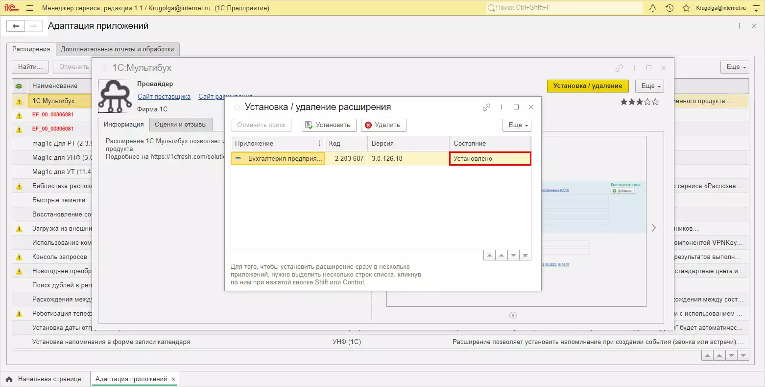 Установим расширение из предложенного списка. Для примера возьмем 1С:Мультибух.