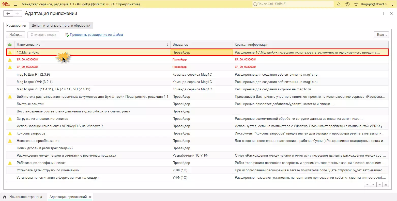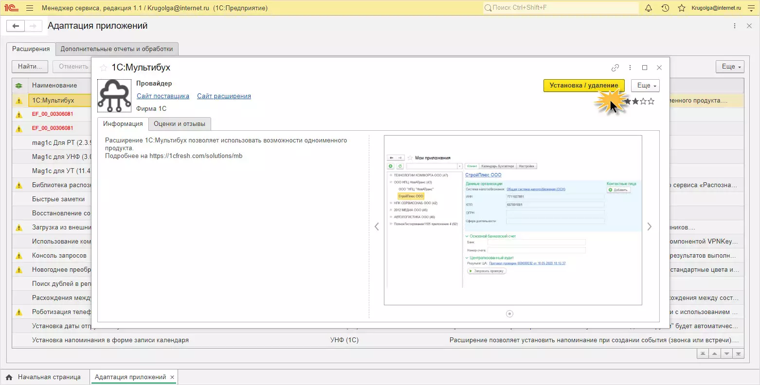 1С:Мультибух – сервис для пользователей, которые ведут несколько информационных баз 1С:Бухгалтерия предприятия. Для работы с ним необходимо установить расширение.