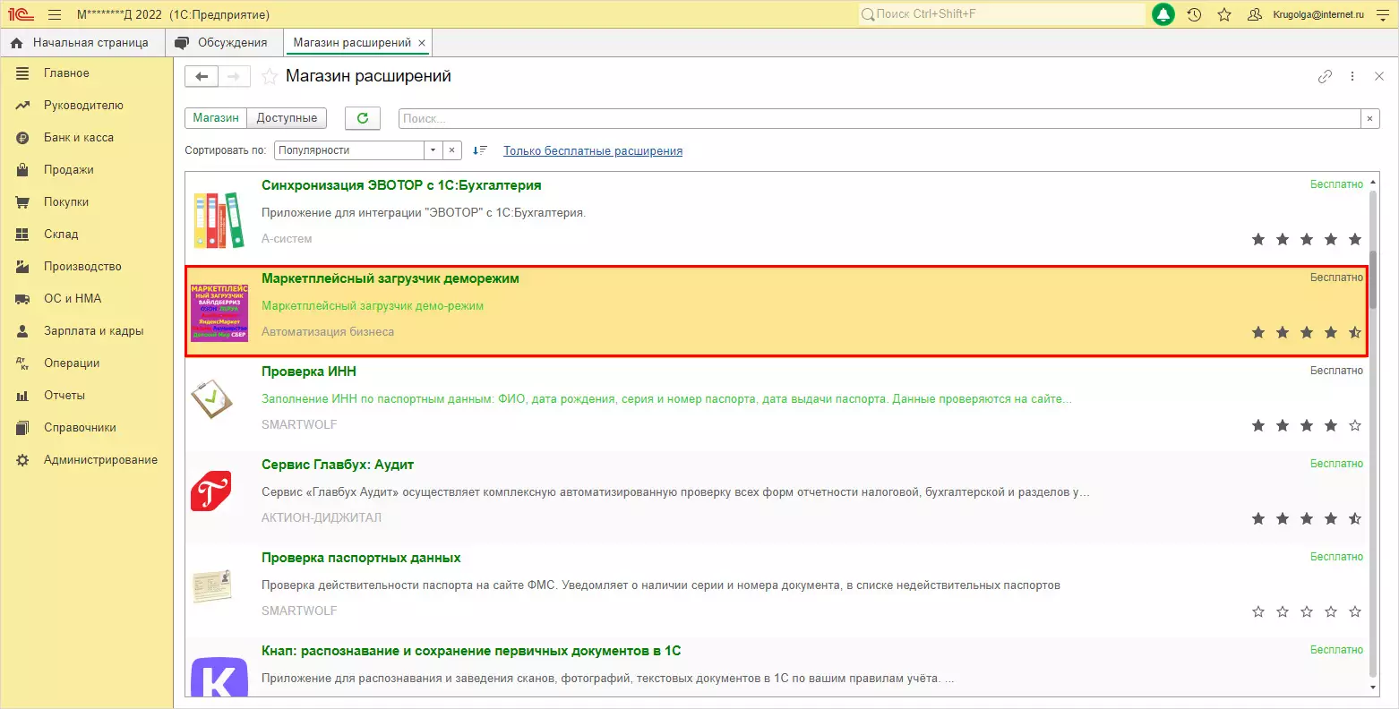 Установим для примера бесплатное расширение из магазина Маркетплейсный загрузчик деморежим.