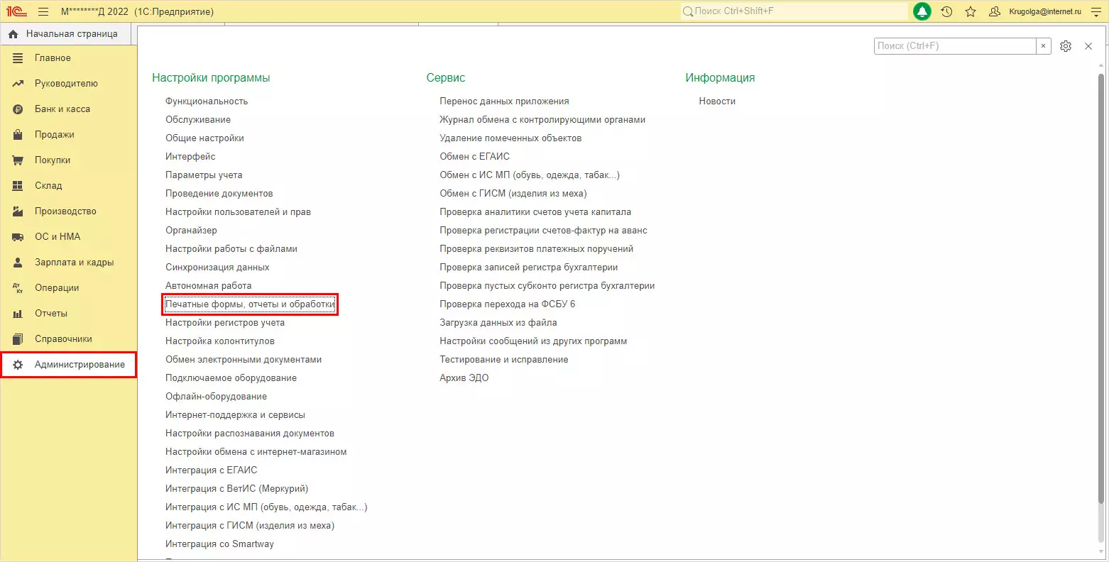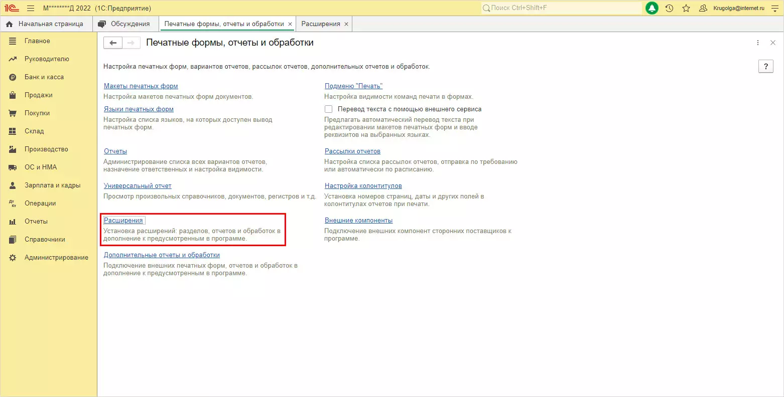Шаг 6. Перейдите в раздел Администрирование - Печатные формы, отчеты и обработки - Расширения.