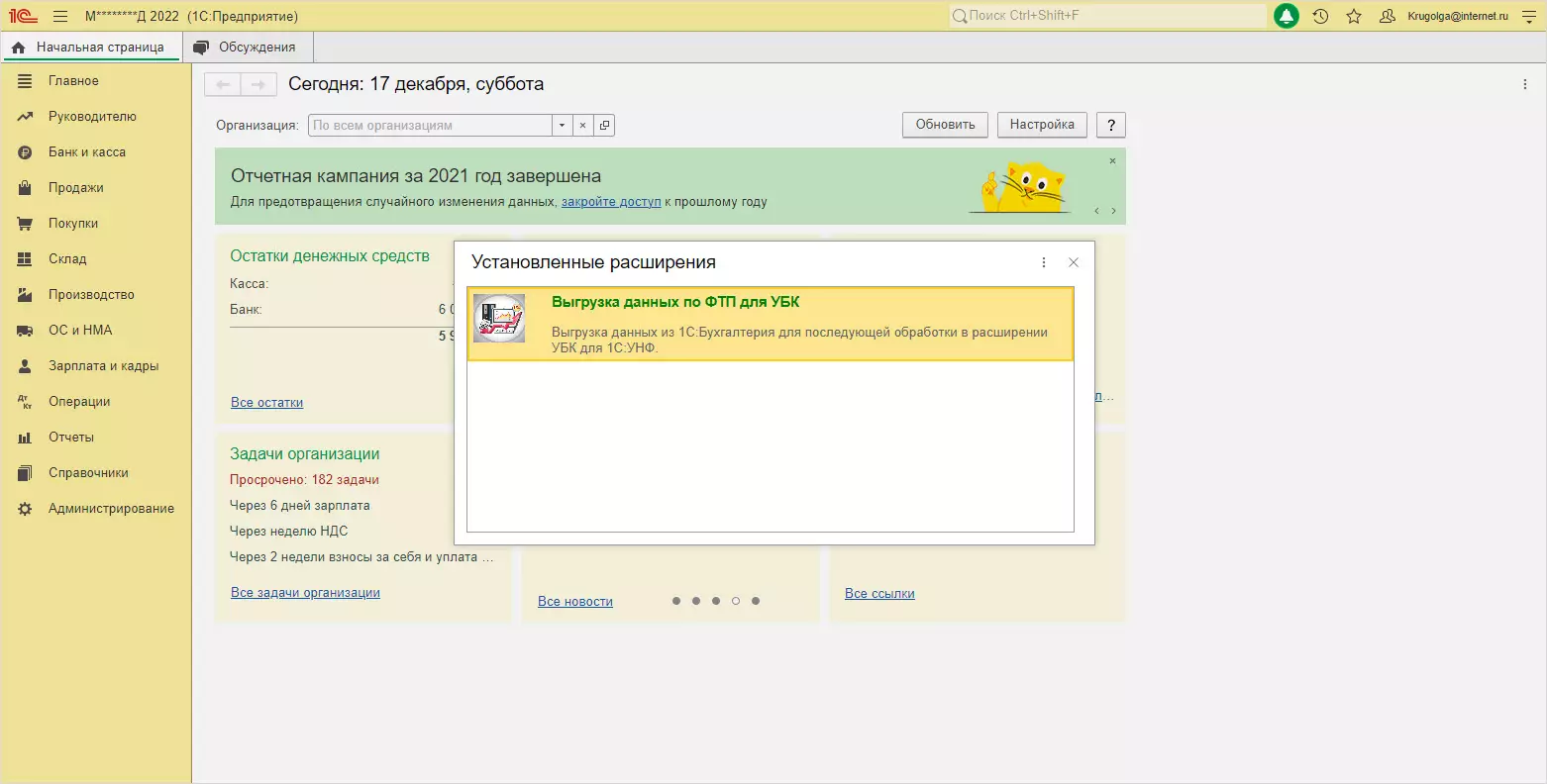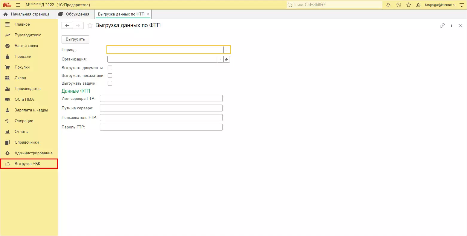 В примере с установкой расширения как дополнение, в главном меню появился дополнительный раздел Выгрузка УБК - Выгрузка данных по ФТП.