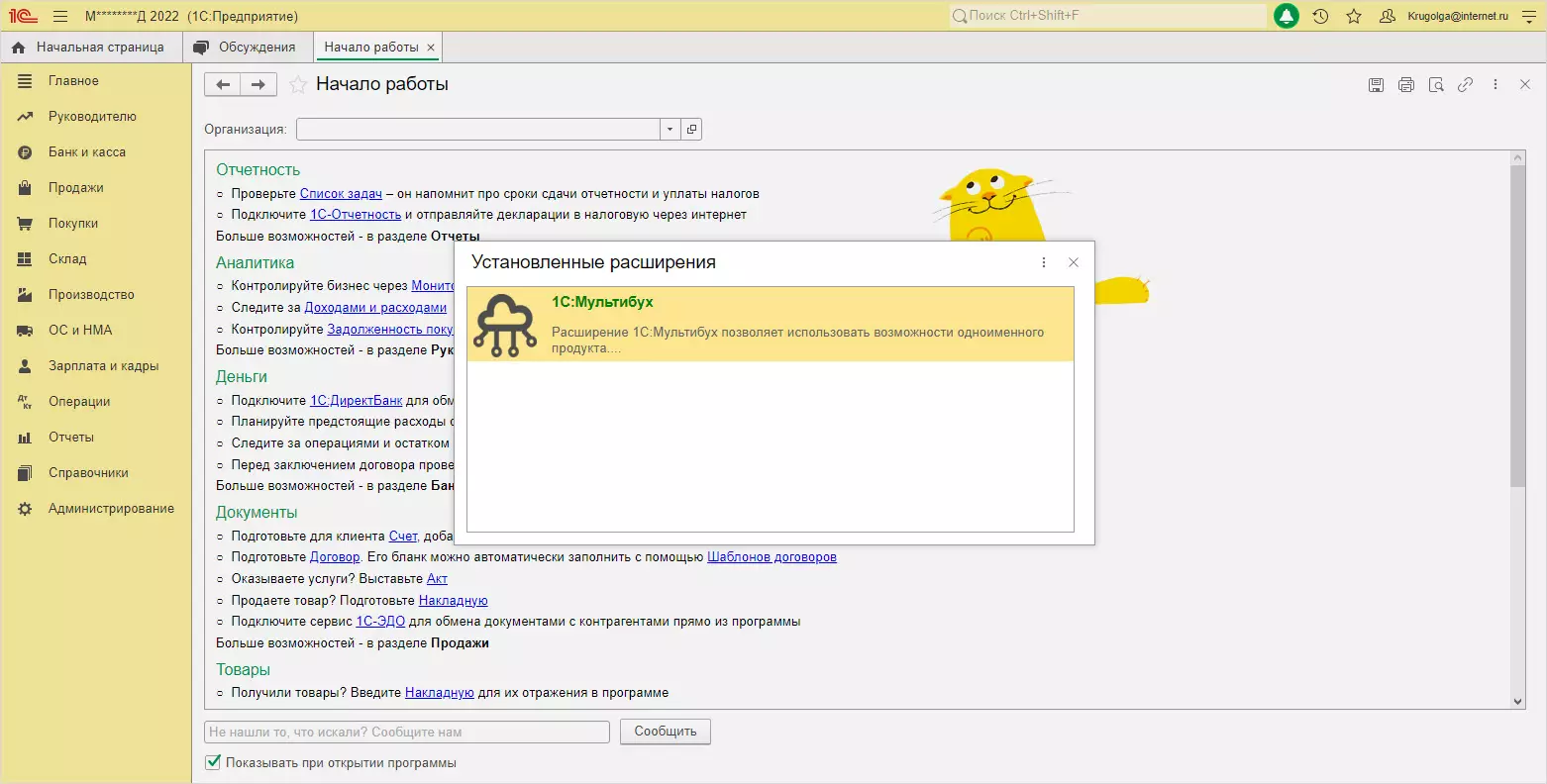При запуске информационной базы 1С пользователю система сообщит информацию о том, что установлено расширение.