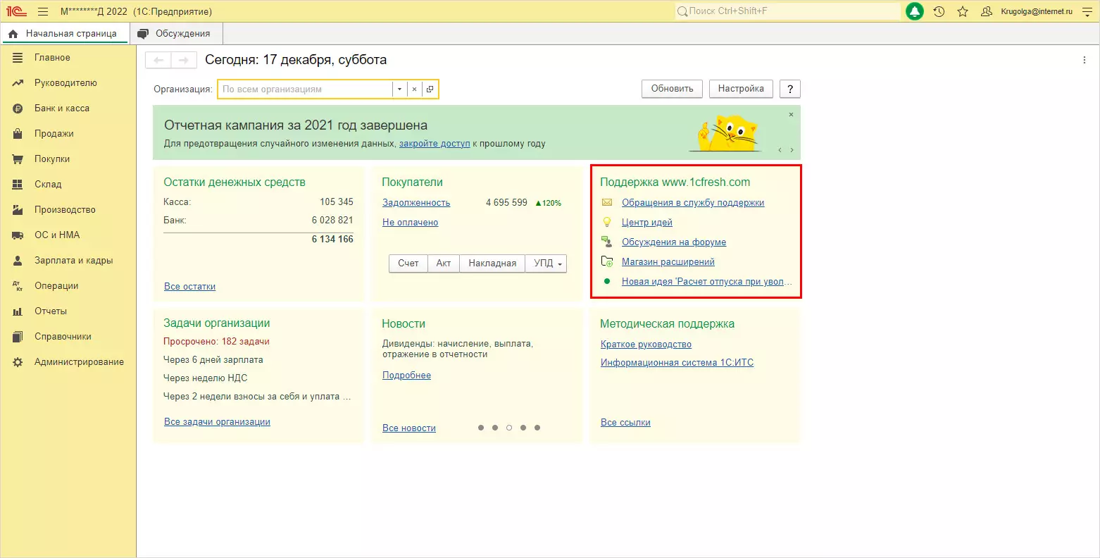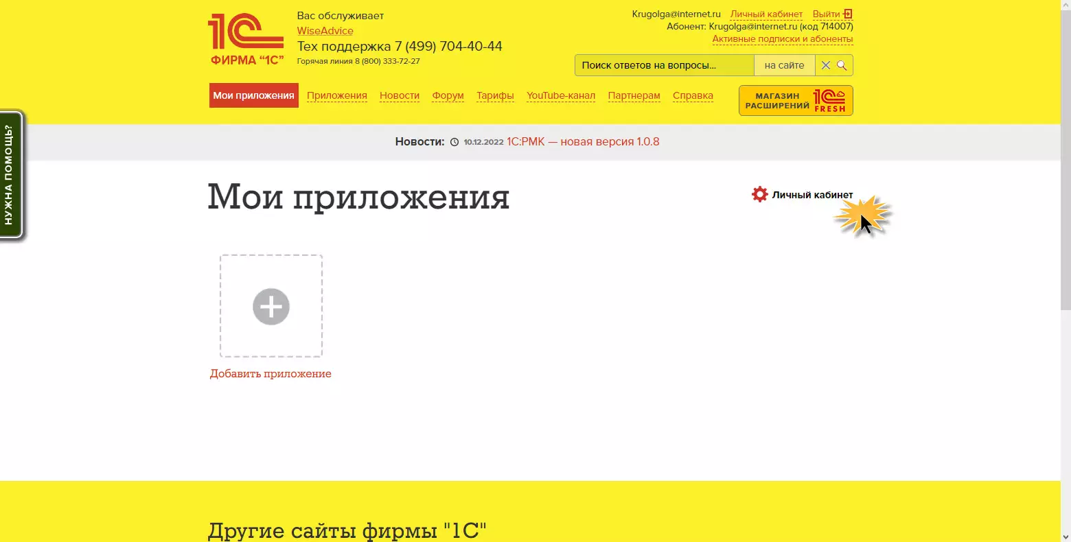 Войдя в свой аккаунт 1С:Фреш перейдите в Личный кабинет.