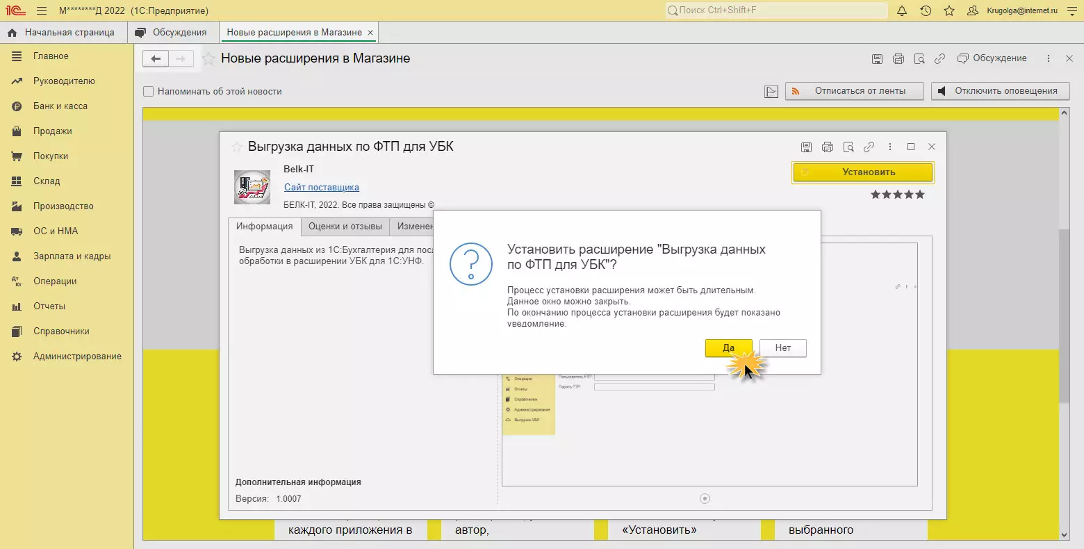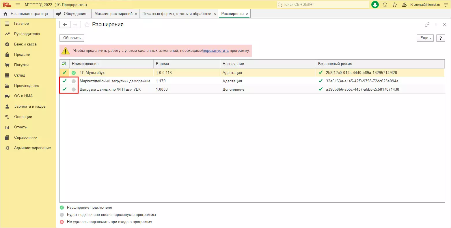 Так как мы находимся в приложении 1С, при установке расширения его требуется перезапустить.