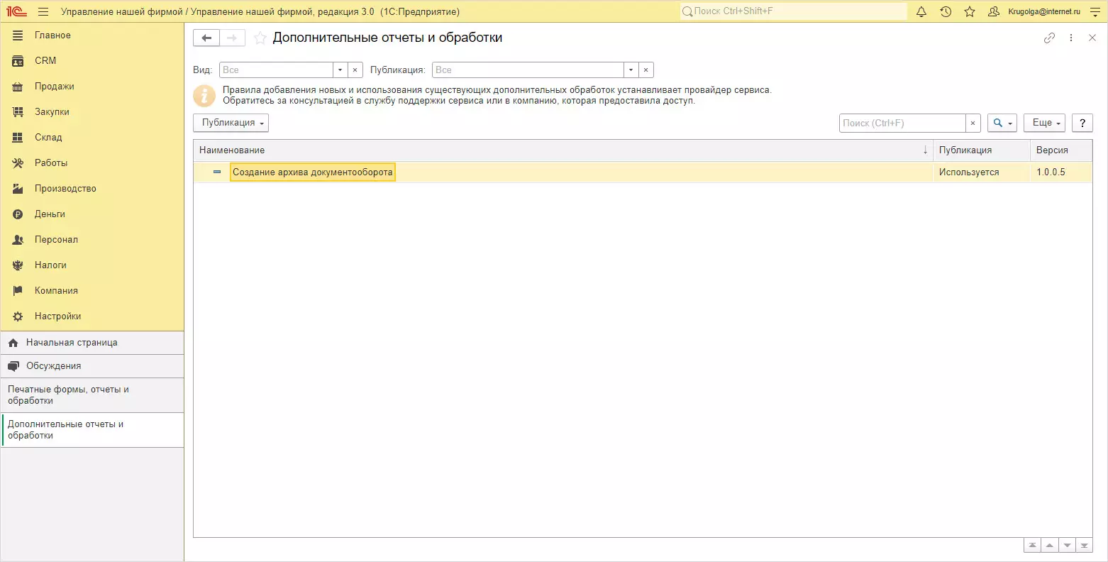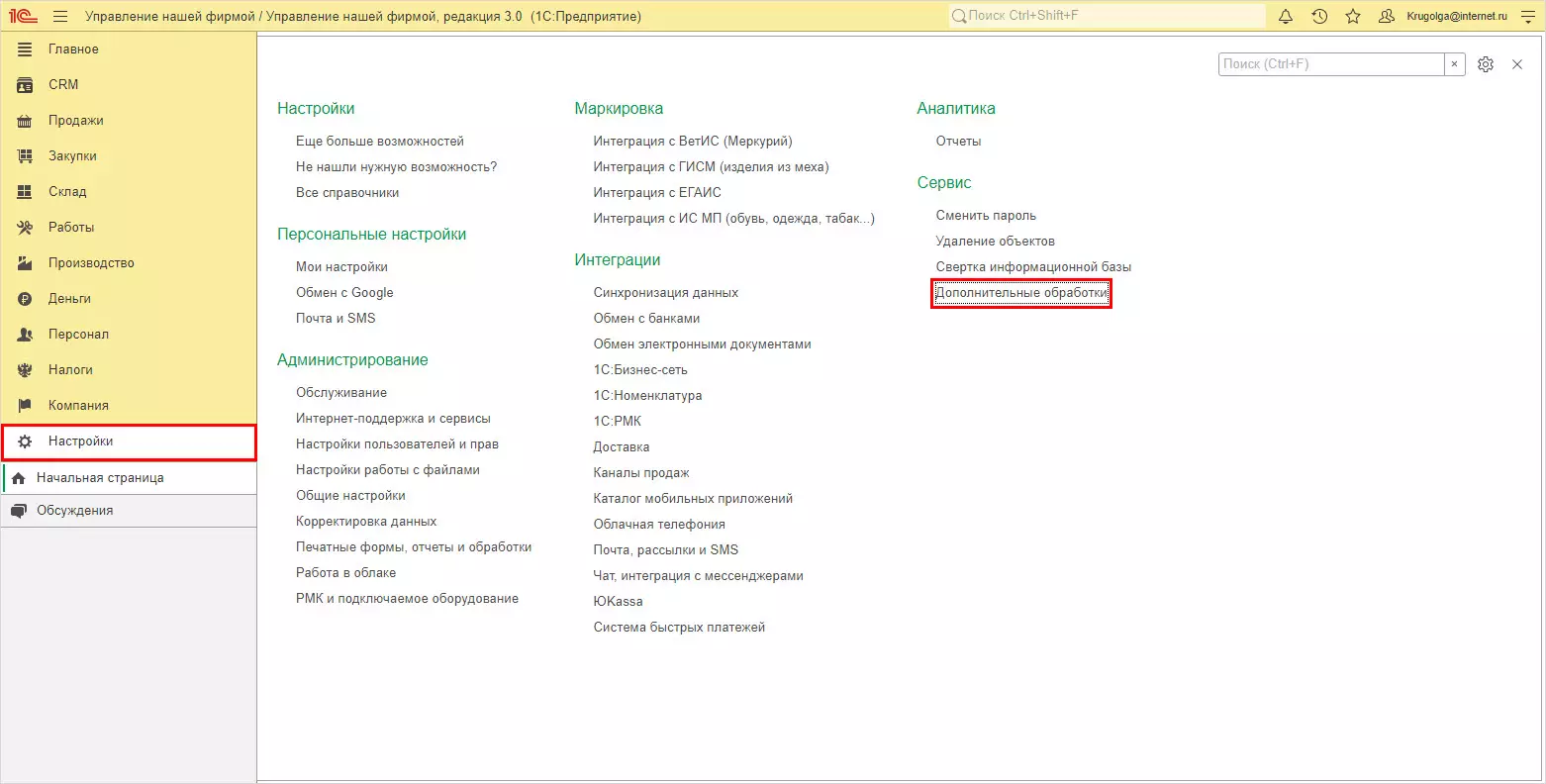1С:Управление нашей фирмой – обработка добавлена в указанный раздел Настройки, выделив отдельно подраздел Дополнительные обработки.