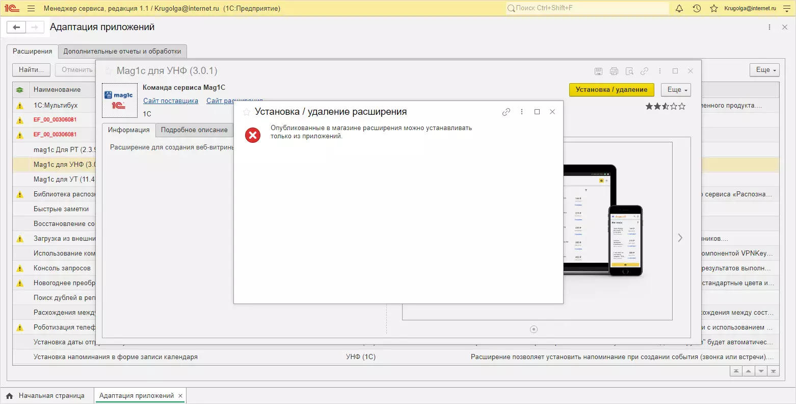 Отметим, что команда установки доступна по тем позициям, к которым имеются доступ у владельца профиля. В рассмотренном выше примере это поля, где указан владелец «Провайдер». Для других появится предупреждение – «Опубликованные в магазине расширения можно установить только из приложений».