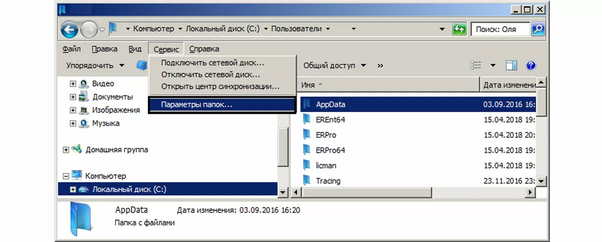 Найдем и откроем эту папку через «Мой компьютер». Если вы папку не находите, так как она может быть скрыта настройками компьютера, надо в меню «Сервис»-«Параметры папок...» установить видимость скрытых файлов. Вызвать строку меню в окне можно нажав кнопку «Alt».
