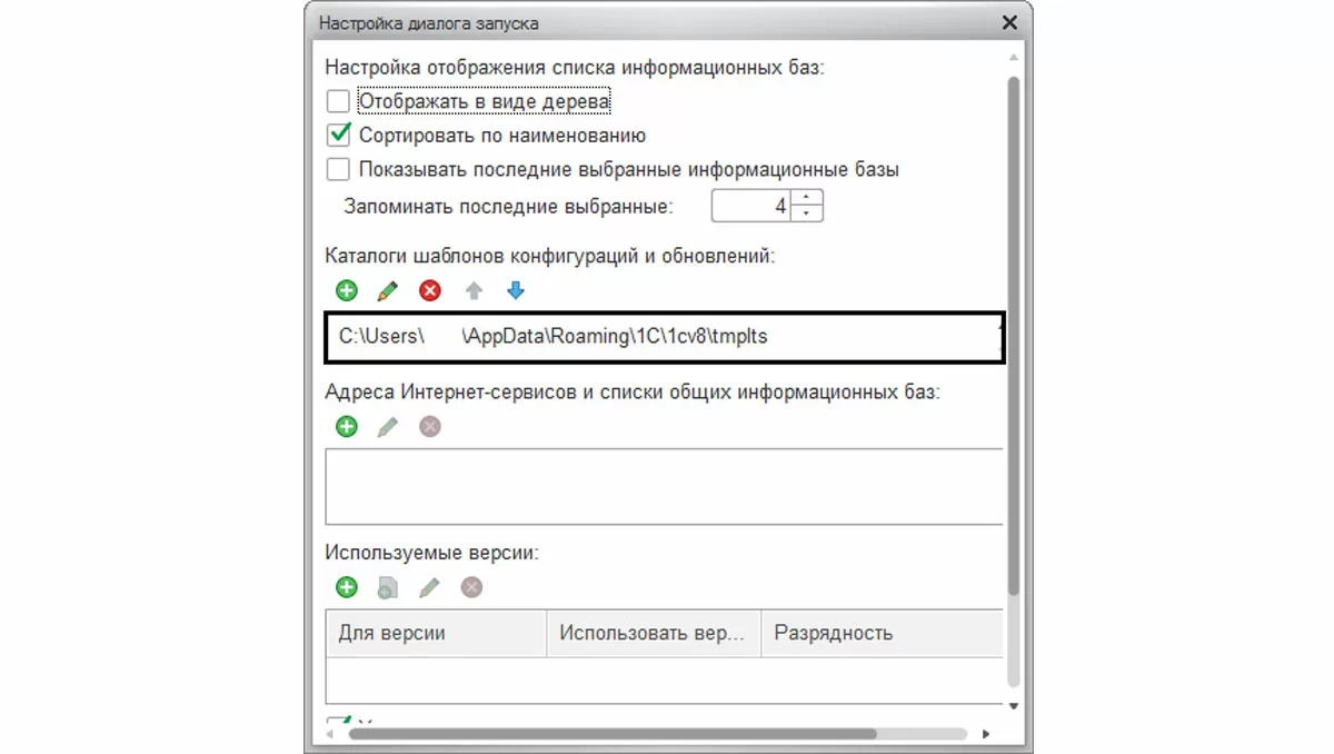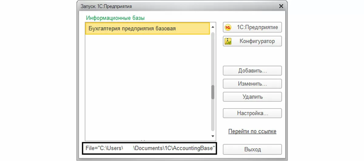 Если удаление файлов не дало результата, можно также удалить временные файлы, расположенные в каталоге информационной базы. Посмотреть, где она располагается, можно в окне запуска 1С. Внизу окошка будет указан путь к выделенной информационной базе.
