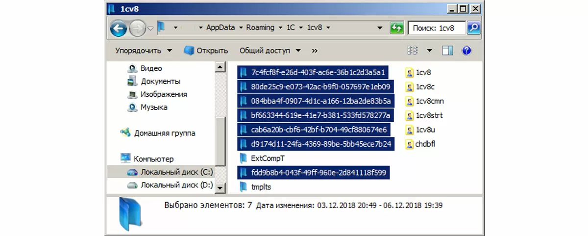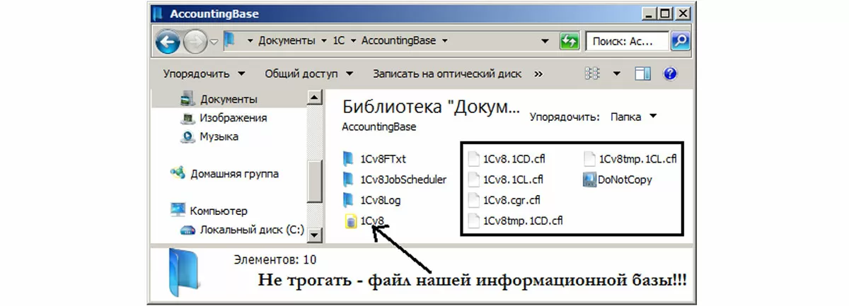 Открыв папку, мы видим в ней файлы. Файл 1Cv8 – это файл конфигурации, его трогать нельзя, это наша информационная база, а остальные файлы временные, их также можно удалить.