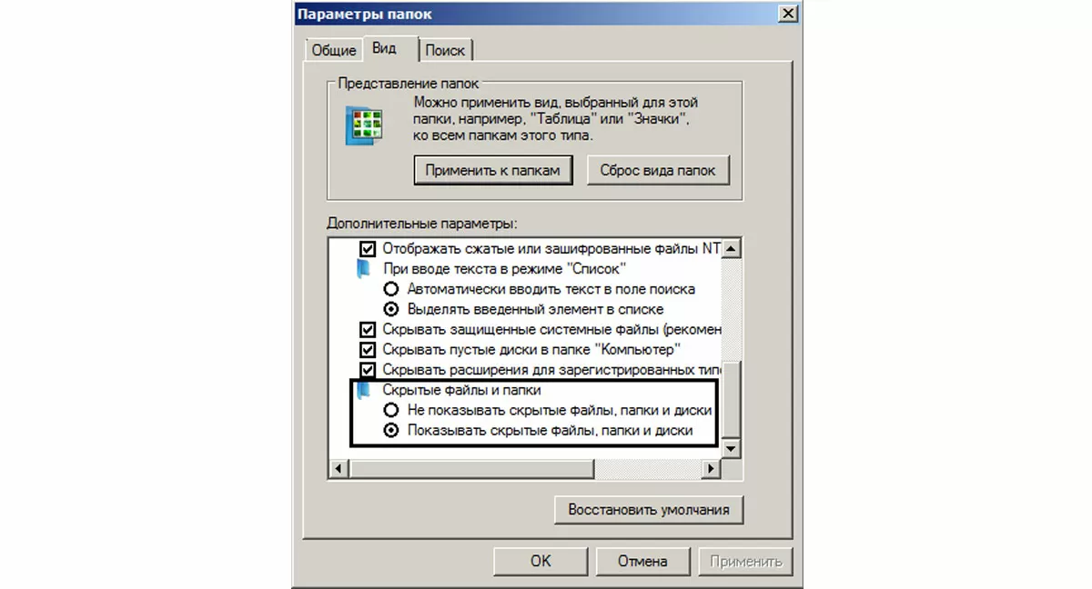 В открывшемся окне на закладке «Вид» устанавливаем переключатель в положение «Показывать скрытые файлы и папки».