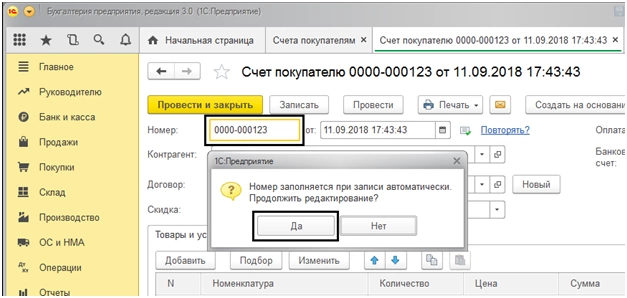 Откроем документ и попытаемся отредактировать номер. На наши действия программа выдает сообщение о том, что номер заполняется автоматически, и предлагает его отредактировать.