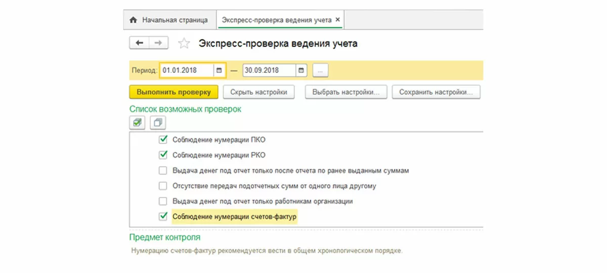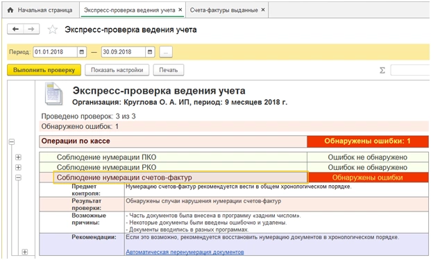В версии программы 1С:Бухгалтерия 3.0 реализована возможность проверки нумерации ПКО, РКО, счетов-фактур и автоматического исправления нумерации в хронологическом порядке. Для этого предназначен сервис «Экспресс-проверки».