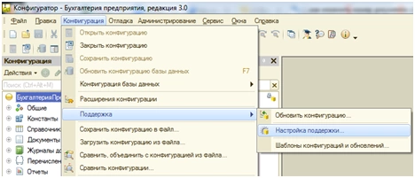 Прежде чем мы будем вносить изменения, надо снять защиту с изменения конфигурации. «Конфигурация» - «Поддержка» - «Настройка поддержки».