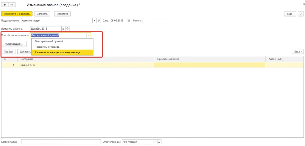 Чтобы изменить способ расчета в документе «Изменение оплаты труда», нужно включить флажок «Изменить аванс» и выбрать нужный (Рис. 6). При помощи документа «Изменение оплаты труда» можно изменить способ расчета для одного сотрудника.