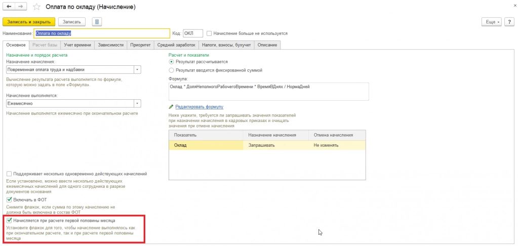 Помимо этого в табличную часть попадают только те виды оплат, у которых активен флаг «Начисляется при расчете за первую половину месяца» (рис. 9). Надо учесть, что в табличную часть «Начисление за первую половину месяца» не попадут сотрудники, для которых были зарегистрированы неявки документами «Отпуск», «Больничный», «Отсутствие (болезнь, прогул, неявка)», «Командировка» или документом «Табель» был зарегистрирован вид времени, который соответствует отсутствию.