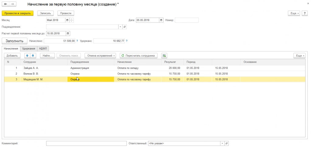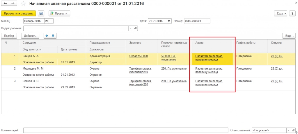 После нажатия на кнопку «Заполнить» в табличную часть документа попадут только те сотрудники фирмы или выбранного отдела, для которых способ – «Расчетом за первую половину месяца».