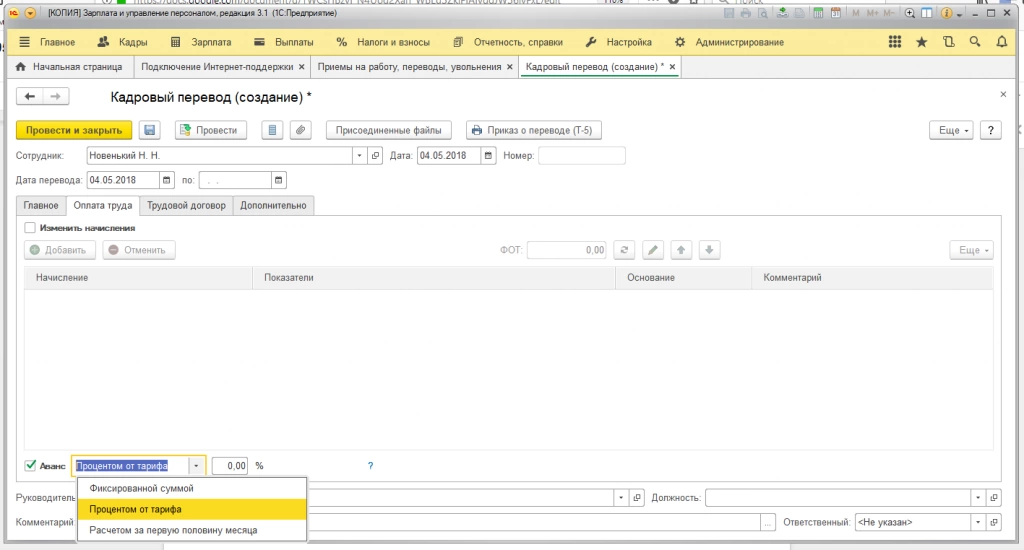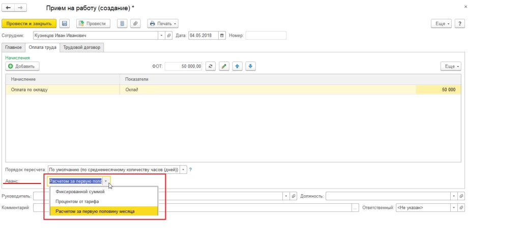 Автоматизация расчета зарплаты, аванса, премий, надбавок, налогов и взносов для сокращения ошибок и оптимизации трудозатратСпособ начисления выплаты в 1С ЗУП 3.1 назначается каждому сотруднику. Назначение способа производится в документе «Прием на работу». Способ указывается на закладке «Оплата труда» (рис.1).