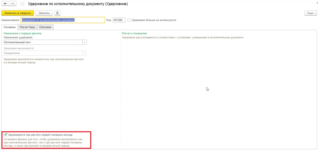 Если работник имеет удержания из зарплаты, то в «Расчет за первую половину месяца» попадут только те из них, которые отмечены флажком «Удерживается при расчете первой половины месяца» (Рис. 10). Расчет пособий и взносов при нашем расчете не производится.