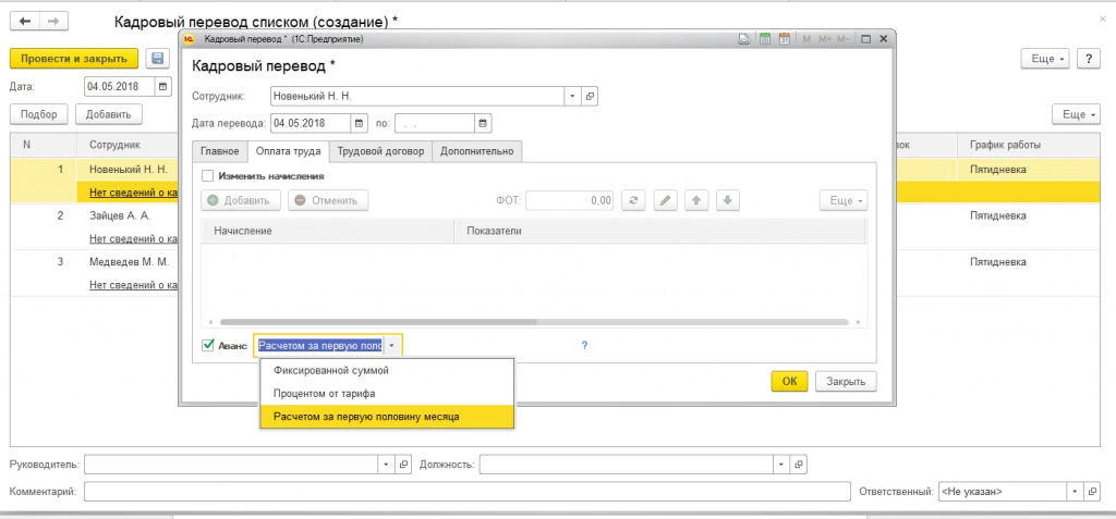 Чтобы изменить схему начисления в «Кадровый перевод списком», нужно заполнить табличную часть документа сведениями о работниках, у которых требуется изменить способ начисления. Дважды щелкнув мышкой по сотруднику, в появившемся окне надо выбрать закладку «Оплата труда», включить флажок «Аванс» и выбрать из списка нужный нам способ. Возможные значения списка (в порядке следования):