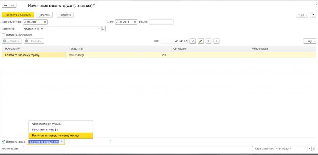 При выплате фиксированной суммой – расчет производится без учета отработанного времени. Если процентом от тарифа – расчет также производится без учета отработанного времени, а для расчета размера заработной платы за указанный период учитывается весь фонд оплаты труда работника (все плановые начисления, назначенные работнику). То есть, если выплата настроена процентом от тарифа, отсутствует возможность при выплате учитывать только некоторые из плановых начислений. Например, при выборе способа расчета процентом от тарифа, нельзя рассчитывать размер заработной платы за первую половину месяца только от размера оклада, без учета ежемесячной премии.